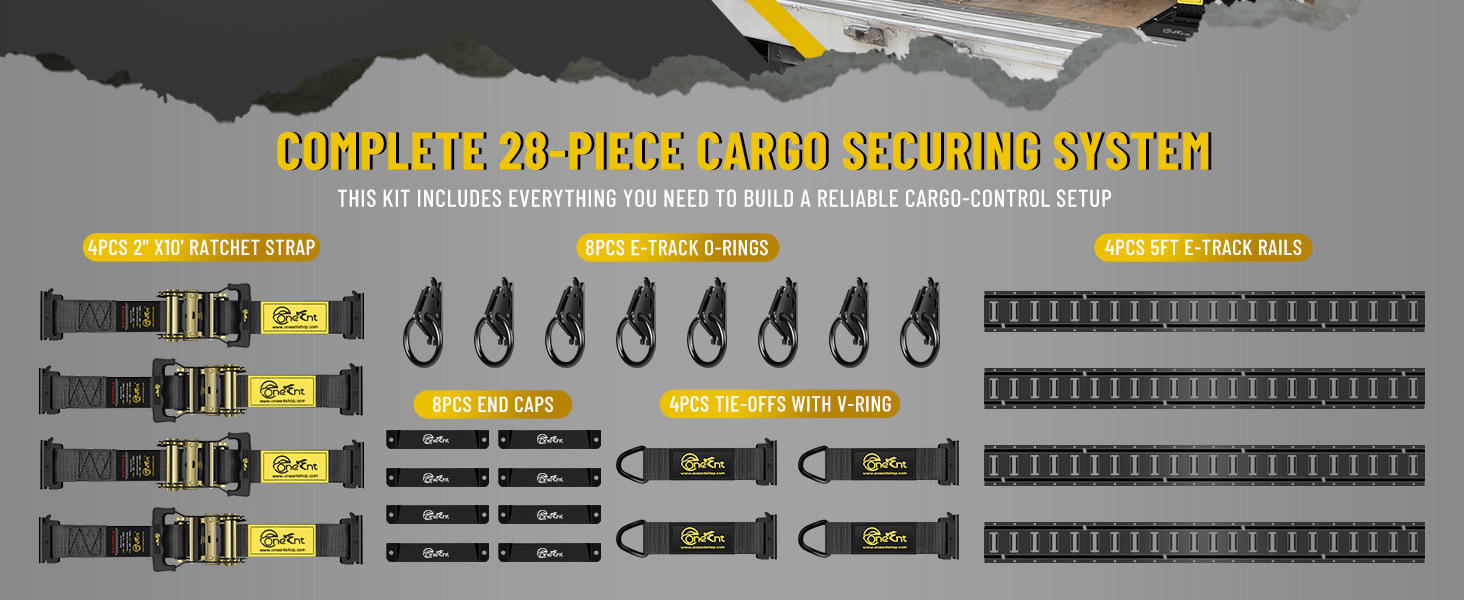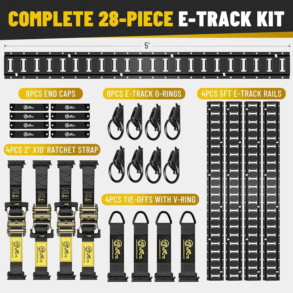 28 PIECE E-TRACK SYSTEM KIT: Comes with (4) 5ft heavy-duty E-Track rails, (4) 2"×10' ratchet straps, 8 O-rings, 4 tie-offs with V-rings, and 8 end caps—everything you need to build a secure cargo-control setup in trailers, trucks, vans, and enclosed haulers.