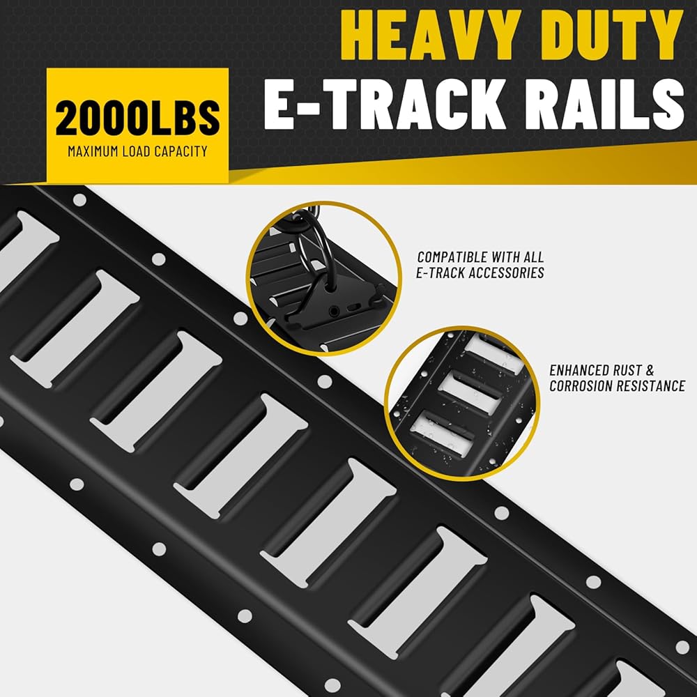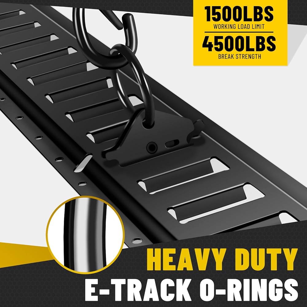 FAST INSTALLATION: The guide rail can be directly mounted on wooden or metal surfaces using bolts or screws (not included).E-Track fittings lock into place with a quick-spring mechanism, ensuring your load stays secure during transportation—no shifting, sliding, or tipping.