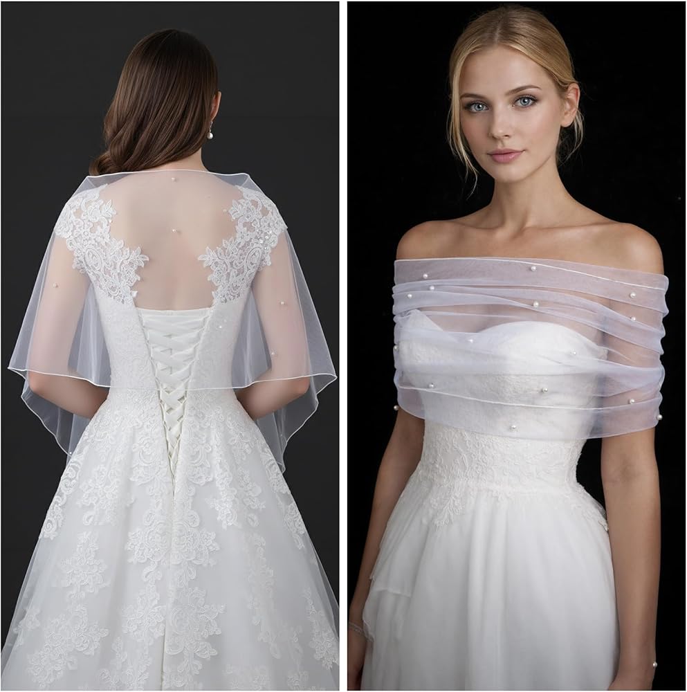 The classic white shawl features a tasteful scattering of luminous pearls across the delicate tulle cape fabric, catching the light with every movement. Wearing this sheer shawl unveils a romantic aura; it's the ideal sheer shawl for evening dresses, galas, and formal parties. Consider it an essential piece of shawls and wraps for weddings, perfect for the bride, bridesmaids, and mothers of the bride.