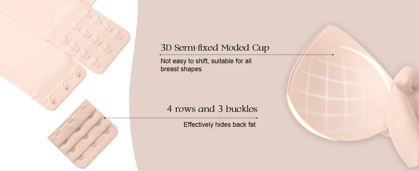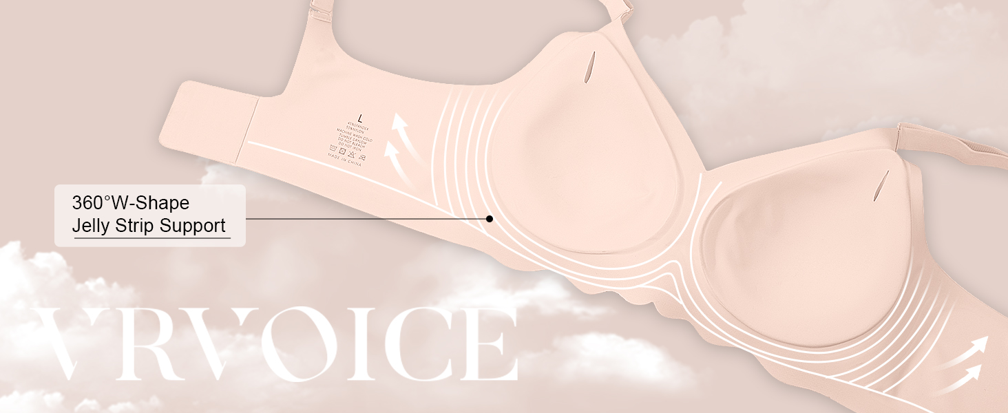 【"W" Shape Jelly Strip Support 】Featuring the innovative "W" shape jelly strip design and 360° full coverage support, this wireless bra delivers all-around support and strong wrap-around fit. It creates a naturally lifted and push-up bust line, effectively hiding side boobs and smoothing back fat, while preventing sagging breast, for a perky and neat silhouette