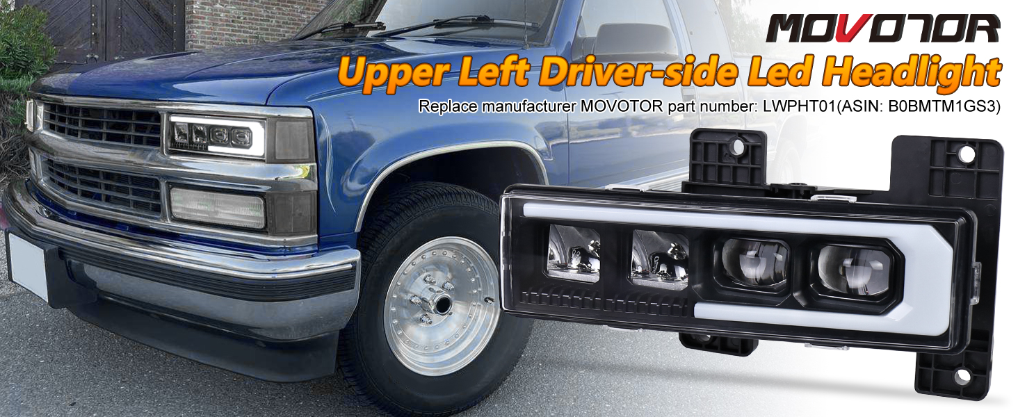 Perfect Fitment: Compatible with 1998-1998 chevy/GMC C10 pick up truck, 1988-1998 Chevy C1500/ C2500/ C3500, 1988-1998 Chevy K1500/ K2500/ K3500,1992-1999 Chevy Suburban 1500/ 2500, 1992-1994 Chevy Blazer, 1995-1999 Chevy Tahoe, 1988-1998 GMC C1500/ C2500/ C3500, 1992-1999 GMC Suburban 1500/ 2500, 1992-1999 GMC Yukon. Replace the OEM Part No.:15034929. Replace manufacturer MOVOTOR part number: LWPHT01 (ASIN:B0BMTM1GS3) upper left driver side headlight.