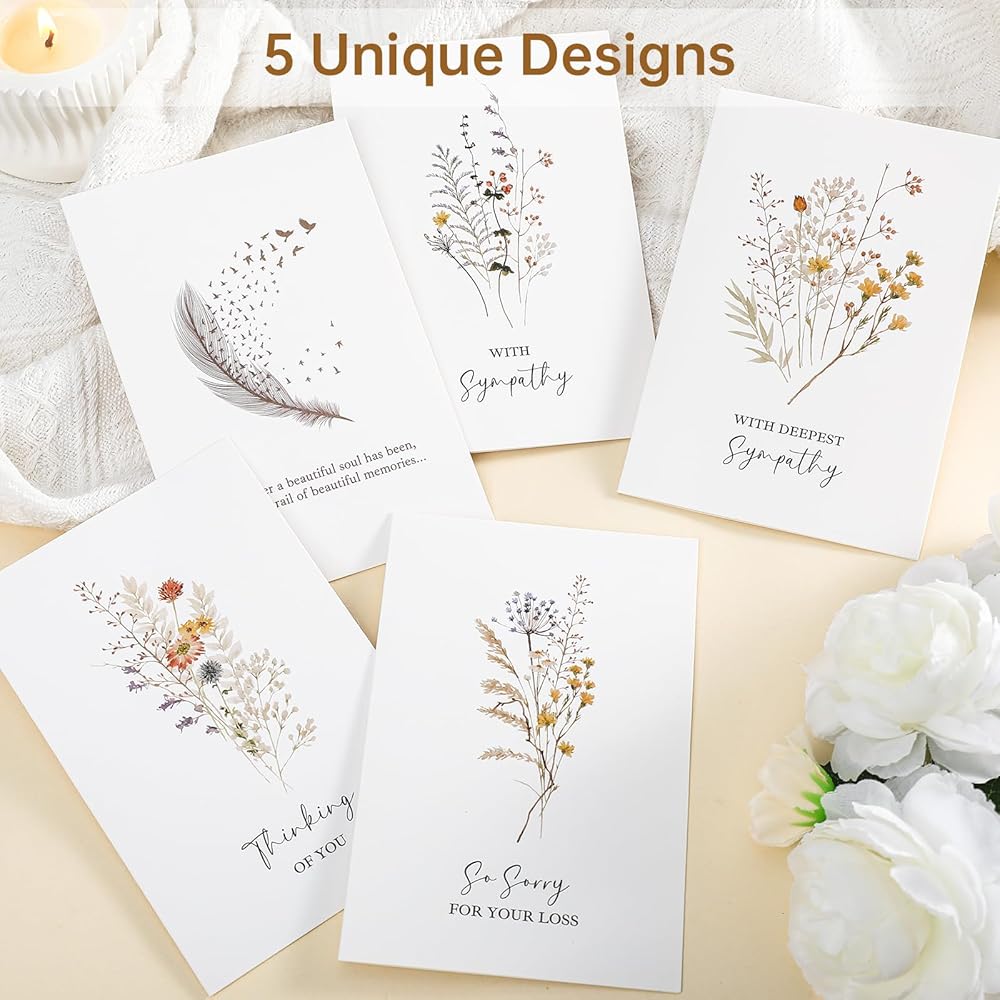 Five Elegant Designs - 20 Sympathy Cards (4" x 6"): This set includes 20 folded sympathy cards with envelopes (4 each of 5 unique designs). The collection features four soft watercolor floral covers and one dove & feather cover design. Each design is paired with thoughtful sympathy messages, offering the right words of comfort during difficult times
