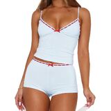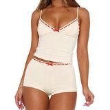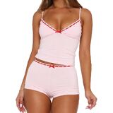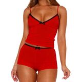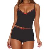 Features: Sexy 2 piece cami pj set, slim fit sleeveless pajama sets, spaghetti strap v neck crop tank top and elastic waist shorts matching lounge set, contrast lace trim, y2k style, low rise boxer shorts for women, bow decor lingerie pajamas