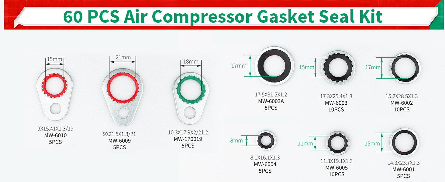 Multi-size: 60 pcs o ring kit with 9 sizes(MW-170019x5, MW-6009x5, MW-6010x5, MW-6001x5, MW-6005x10 ,MW-6004x5, MW-6003Ax5, MW-6003x10, MW-6002x10), total 60 pieces for replacement, meeting your various maintenance needs.