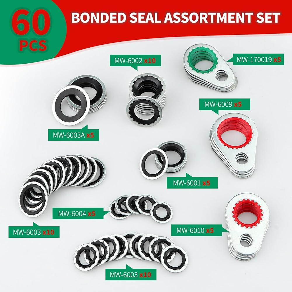 60 PCS A/C System Compressor Gasket Seals, 9 Sizes Automotive Air Conditioning Compressor Port Seal Washer Kit, Universal Repairs Gasket Bonded Seal Assortment Set