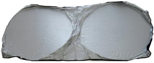 Protect your vehicle's interior from harsh sunlight with this metallic silver auto sunshade. Featuring a practical dual circle design, this collapsible sunshade measures 59 inches in width and 27.5 inches in height, providing excellent coverage for your windshield. The spring loop construction allows for easy installation and compact storage when not in use. This single-piece sunshade effectively blocks UV rays and helps maintain a cooler temperature inside your vehicle during sunny days.