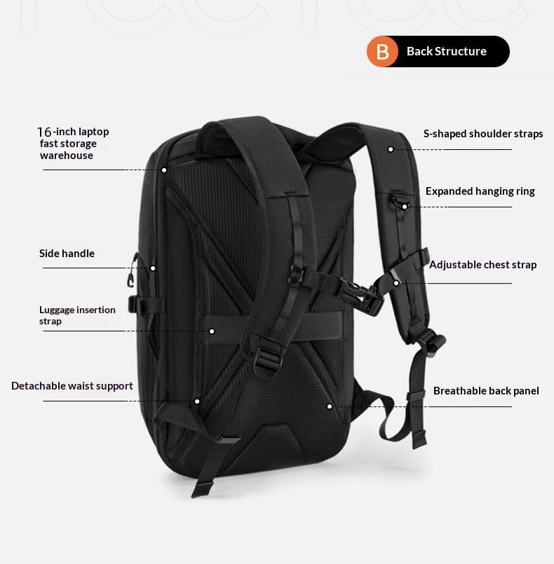 X-Shaped Ergonomic Burden-Reduction System: Features an advanced X-shaped breathable carrying system designed to promote airflow and keep your back dry during long hauls. Equipped with an adjustable chest strap and a detachable load-reducing waist support, it effectively distributes weight to minimize shoulder fatigue. The ergonomic design ensures maximum comfort for daily commuting or outdoor trekking.