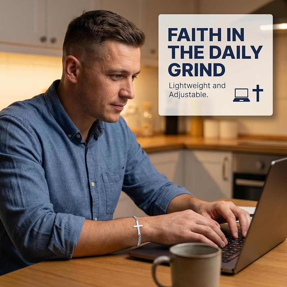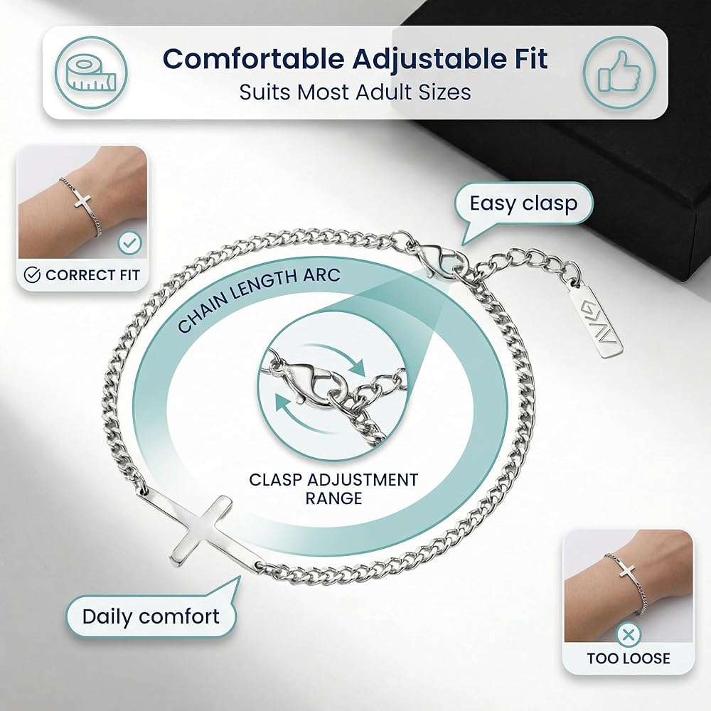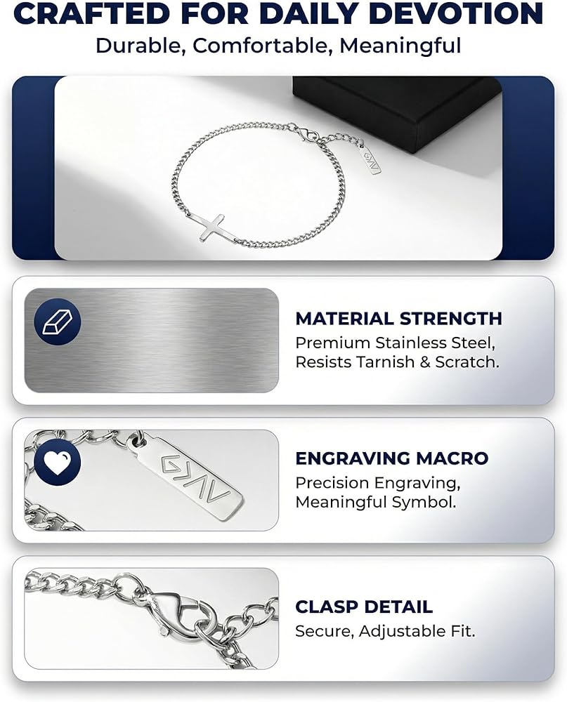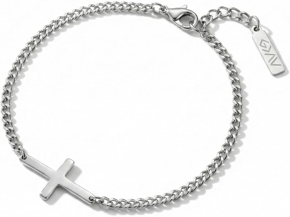 Crafted from 316L stainless steel, this men's bracelet combines timeless style with a clear expression of faith. Designed as a jesus bracelet with a cross centerpiece, it offers a modern take on christian bracelets for men while staying rooted in meaning. The classic chain link profile lays comfortably on the wrist, creating a versatile piece of christian jewelry for men. Built to be worn every day, it's waterproof, corrosion-resistant, lead-free, and nickel-free, giving you a durable catholic bracelet for men alternative that's gentle on skin and strong on symbolism. The bracelet's clean lines and high-shine finish give it a refined presence without feeling flashy, perfect for people who prefer subtle statements. A flexible lobster claw clasp makes it easy to secure and remove, while the sturdy links maintain their shape through daily wear. Thoughtful proportions ensure the cross sits flat on your wrist, keeping this jesus bracelet comfortable during work. Every detail is tuned for long-term wear, from the smooth edges of the pendant to the balanced weight of the chain. Whether you're marking a baptism or milestone birthday, this cross piece fits into meaningful moments. It's an ideal choice for christian bracelets for men who want a reminder of their beliefs without sacrificing style. Give it as a Father's Day gift or wear it solo as your go-to faith accessory. The understated design makes it appropriate for church, office, or casual weekends, offering a quiet, confident nod to what matters most. This stainless steel men's bracelet also complements jesus bracelets for men already in your collection, layering easily with watches or other chains. Its versatile design speaks to men who value both craftsmanship and conviction, turning a simple cross into a daily ritual of remembrance. From first-time wearers of christian jewelry for men to long-time collectors, this bracelet stands out as a stylish way to keep your faith close at hand.