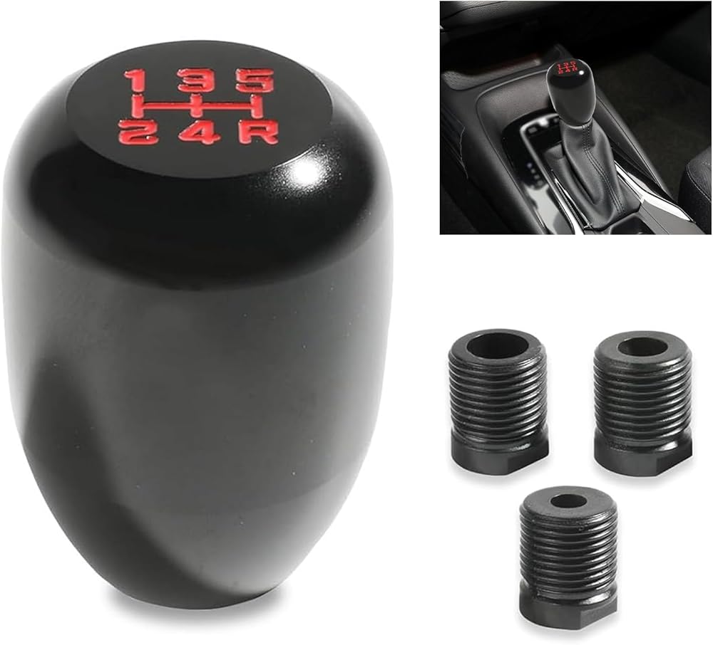 The package includes a five-speed shift knob with dimensions of 1.57 inches x 2.36 inches x 0.86 inches, designed to fit comfortably in the human palm. It also comes with three adapters (3.14 in, 3.93 in, and 4.72 in) to ensure compatibility with most manual transmission cars.
