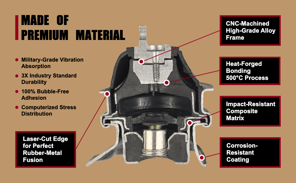 【Premium Quality】Superior materials are utilized along with rigorous quality control standards to meet OE standar.Our high quality steel and rubber ensures a smooth and quiet ride.All parts are tested during the manufacturing process to ensure proper management of engine torque and dampening of excess noise and vibration.