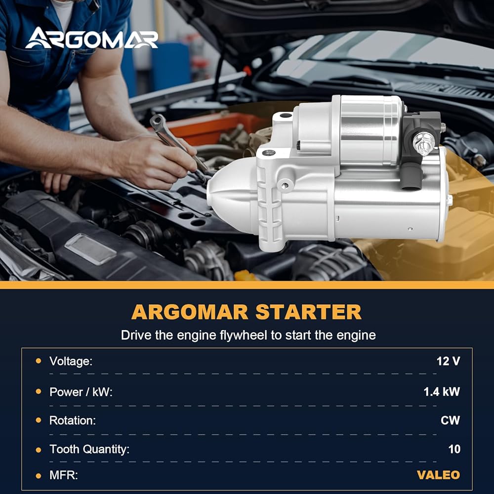 Argomar Starter: Condition:Brand New, 1.4kW/12 Volt, CW(Clockwise), 10-Tooth Pinion, Design:PMGR, MFR:VALEO. (Not compatible with 10910,differs in MFR, power (KW), and engine size. Verify part number and vehicle before ordering)