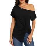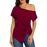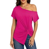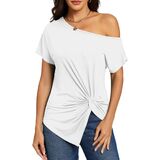 Off the shoulder,front twist knot,ruched shirring detail,batwing short sleeve,asymmetrical hem,side slit,sexy casual dolman tops for women summer trendy