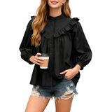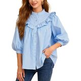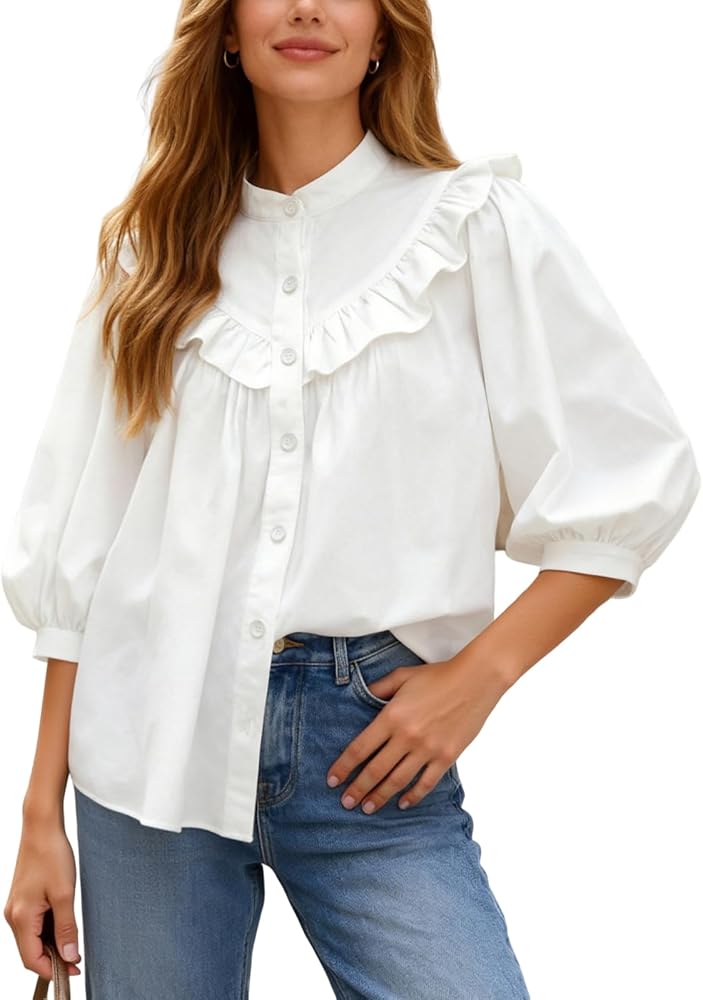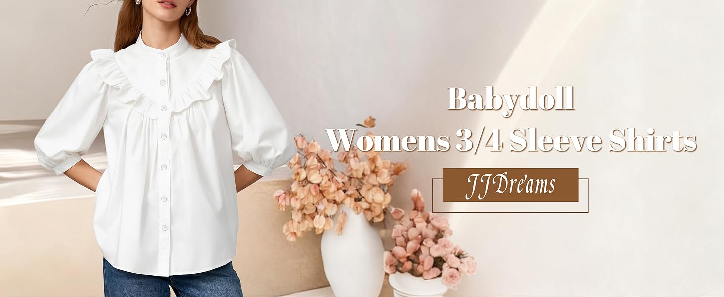 【3/4 Sleeve & Ruffle Details】The 3/4 sleeve design of this babydoll blouse flatters arms, and ruffle trim enhances romantic charm. Button front ensures easy wear, matching stand collar to create a balanced look—cute yet elegant, perfect for versatile styling.