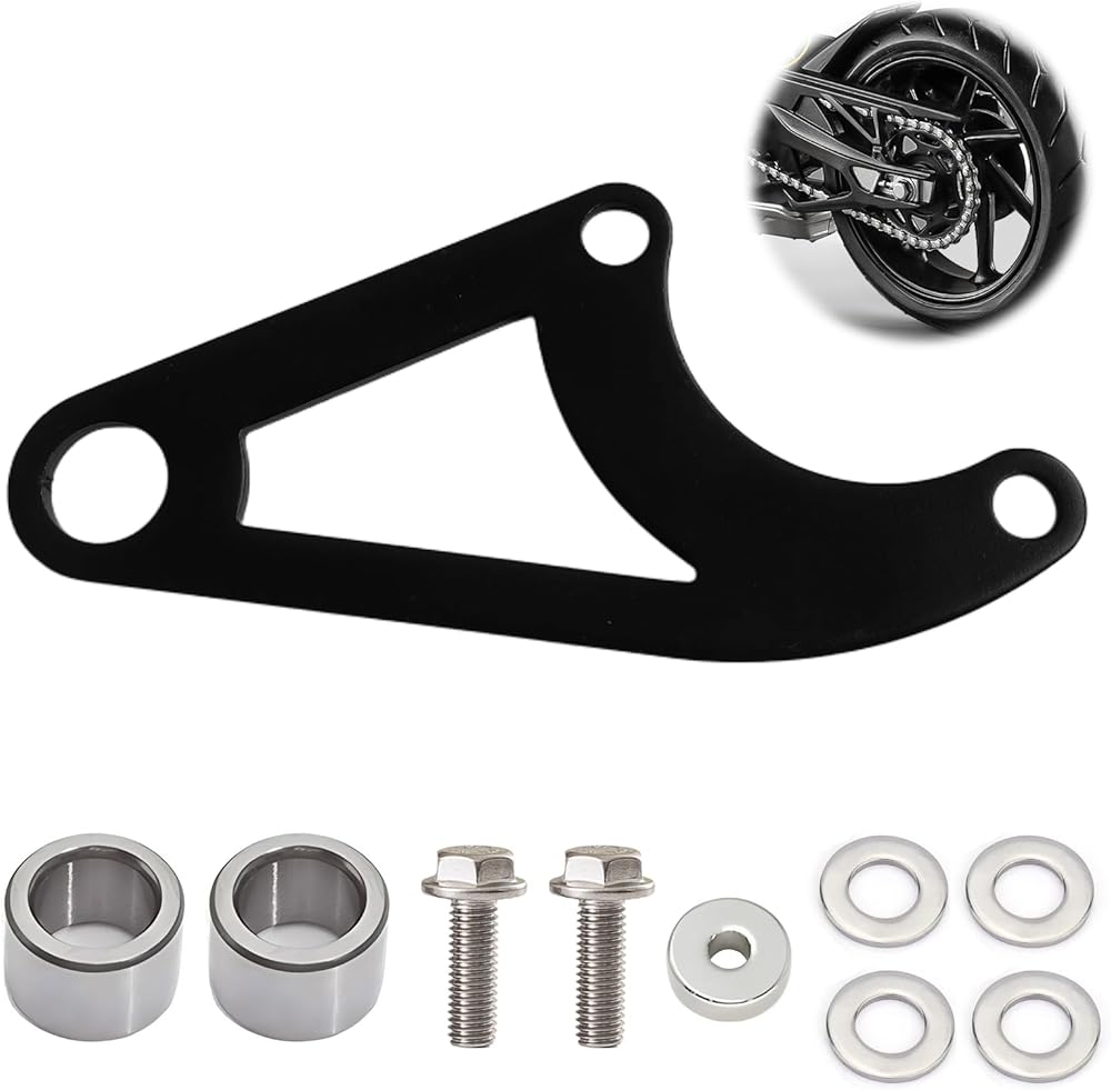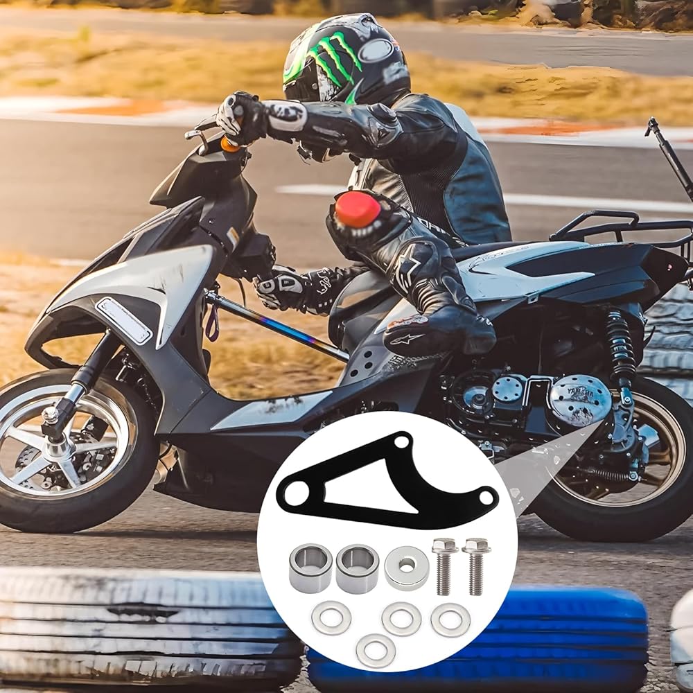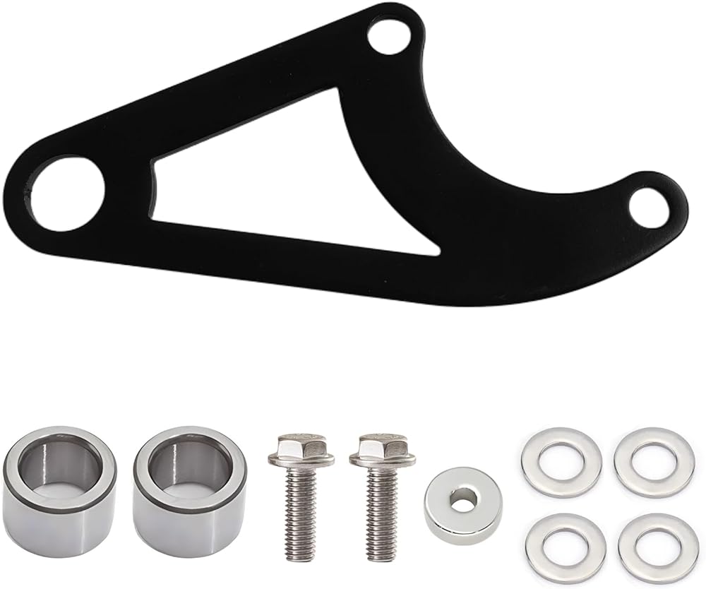 The kit comes complete with all essential hardware for installation: 1 mounting bracket, 1 aluminum spacer bushing, 2 stainless steel bushings, 2 M6 bolts, and 6 stainless steel washers. The compact, bolt-on design makes it easy to install with basic tools and ensures a secure fit without needing extensive modifications to the frame.
