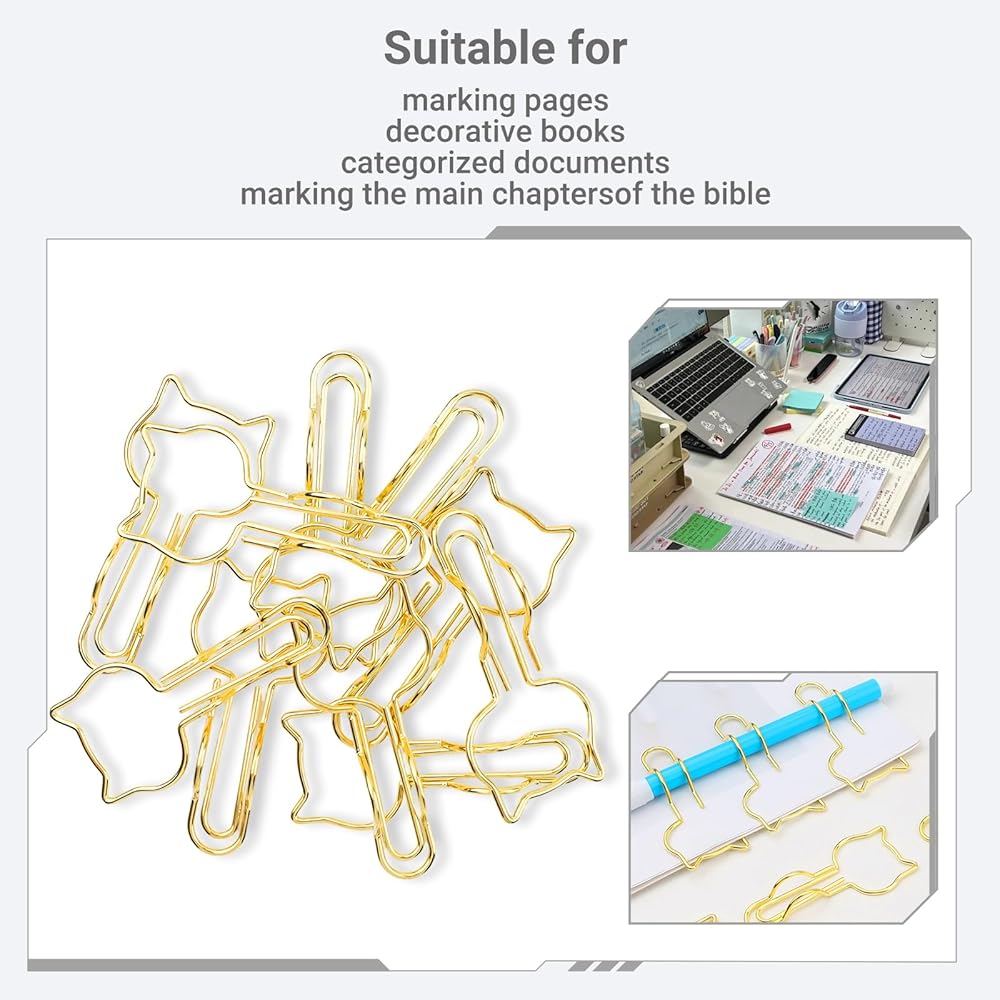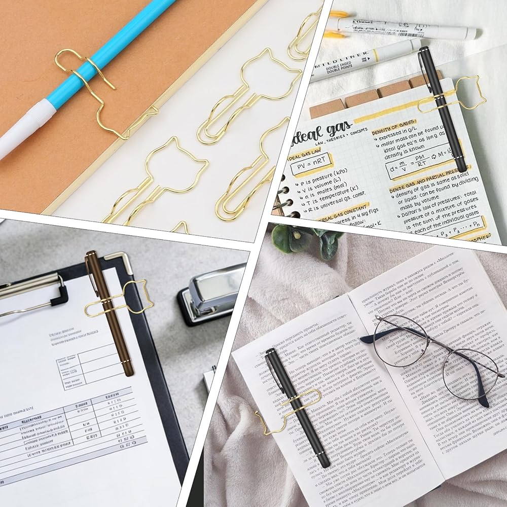 • ADORABLE CAT DESIGN:Gold metal pen clips with delightfully cute cat shapes add a fun, stylish touch to notebooks, planners, papers, and office documents —perfect for cat lovers and desk decor