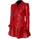 Crafted with the finest-quality real leather material, this asymmetrical peplum jacket for women embodies sophistication, durability, and modern style in one striking design. Made from luxurious Italian lambskin leather, it features a beautifully structured peplum silhouette that flatters the figure while adding a touch of elegance to any outfit. The jacket is thoughtfully detailed with a classic lapel collar, zipper cuffs, and a smooth front zipper closure that enhances its sleek, contemporary appeal. Premium stitching throughout ensures lasting quality, while the soft polyester inner lining provides exceptional comfort and ease of wear. Designed for both fashion and functionality, this women's red leather jacket includes long sleeves, front zipper pockets, and one inside pocket for your essentials. Whether paired with jeans for a chic casual look or styled over a dress for a night out, this peplum leather jacket makes a powerful statement of confidence and class. Check our size chart image to find your ideal fit and experience the unmatched luxury of genuine leather craftsmanship.