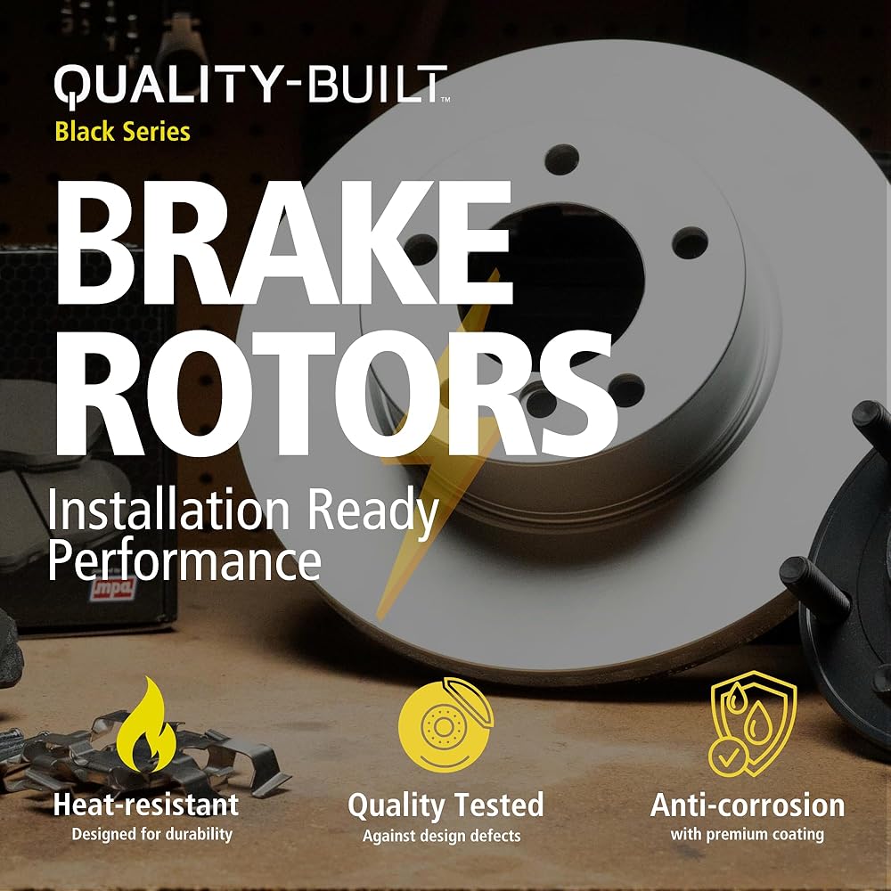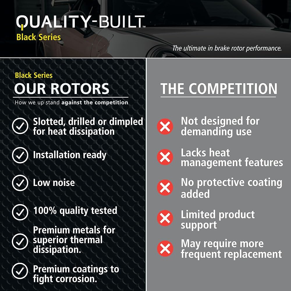 Dial In Precision Braking with QUALITY-BUILT Black Series disc brake rotors. Engineered for drivers who demand more from their braking system, Black Series rotors deliver track-inspired performance for the street. Whether you're replacing an OE rotor due to wear or upgrading your weekend project car, our Black Series rotors deliver a responsive pedal feel and consistent stopping power - mile after mile. Each rotor features OE style designs that promote efficient cooling in all stopping situations. Precision balanced to reduce vibration, promote even wear, and ensure a quiet, smooth ride. Our Q-Sheild premium grade, ENVIRONMENTALLY FRIENDLY coating on each rotor withstands exposure to high temperatures no matter what conditions you throw at it. Built for performance-minded drivers and DIYers, installation is quick and hassle-free thanks to direct OE fitment. Pair them with Black Series brake pads for the full system upgrade — maximum bite, minimal noise, and reliable response in every stop. From aggressive cornering to everyday commuting, QUALITY-BUILT Black Series rotors offer the perfect balance of control, durability, and high-performance braking feel. When your build demands more than stock, step up to rotors that are engineered to keep up.