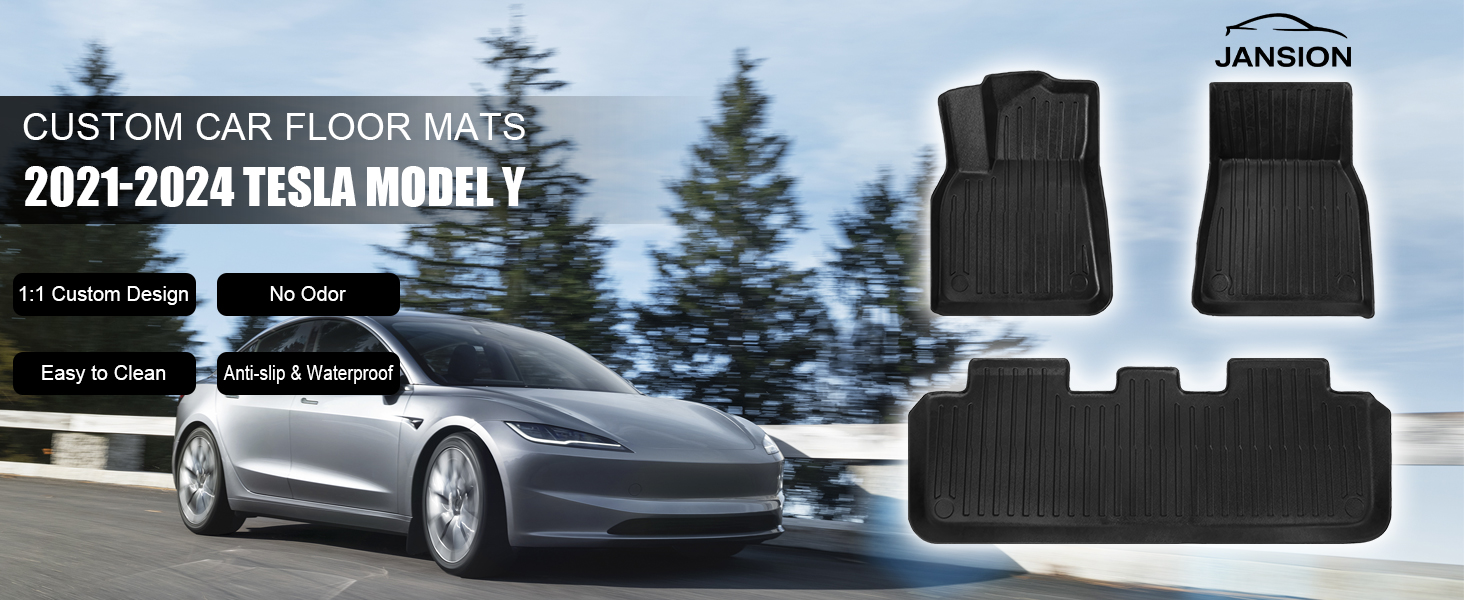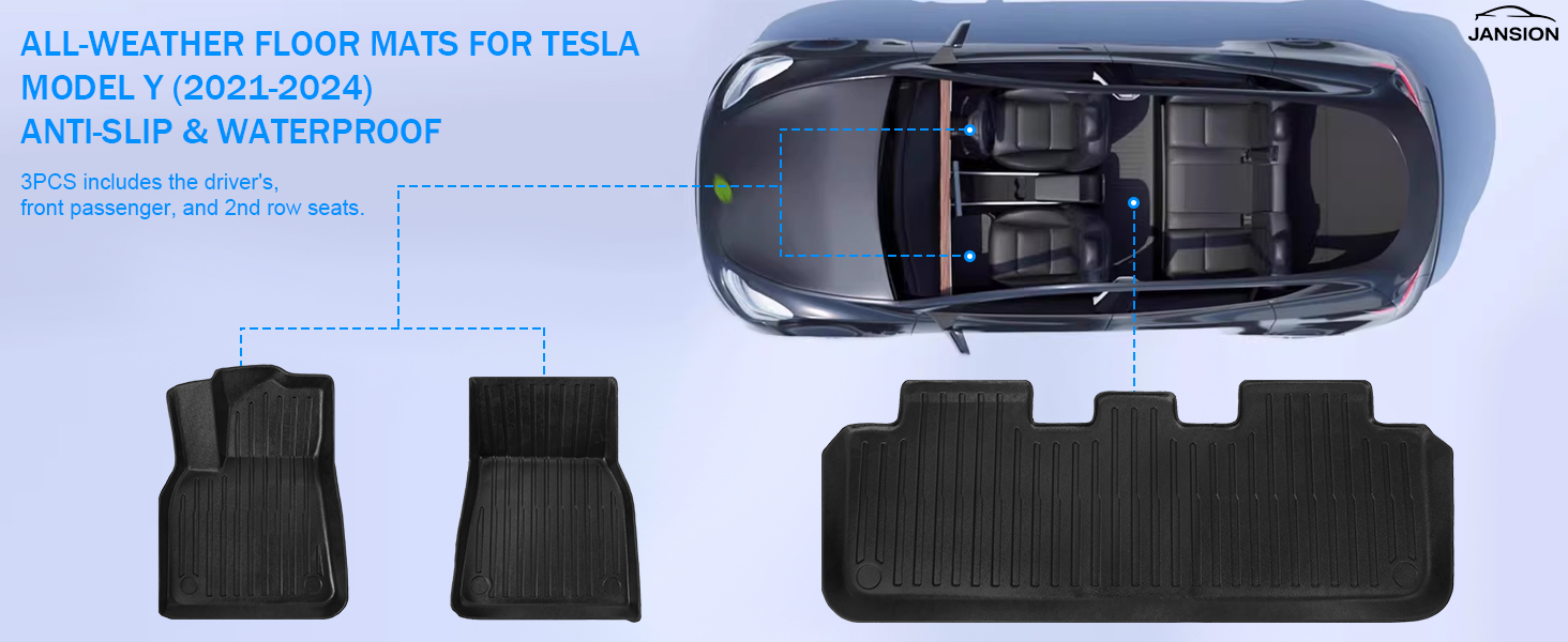 【Outstanding Performance】JANSION Tesla Model Y mats deliver exceptional functionality! Their comprehensive front-to-rear coverage, coupled with superior waterproofing, effectively prevents leaks and repels rain, debris, mud, and snow. Their robust anti-slip properties absorb impact forces, enhancing both comfort and driving experience.