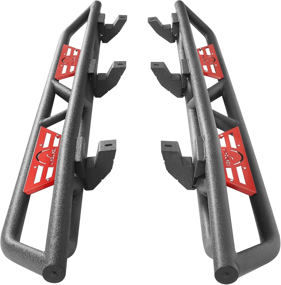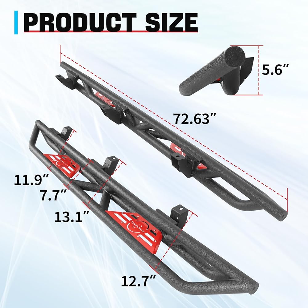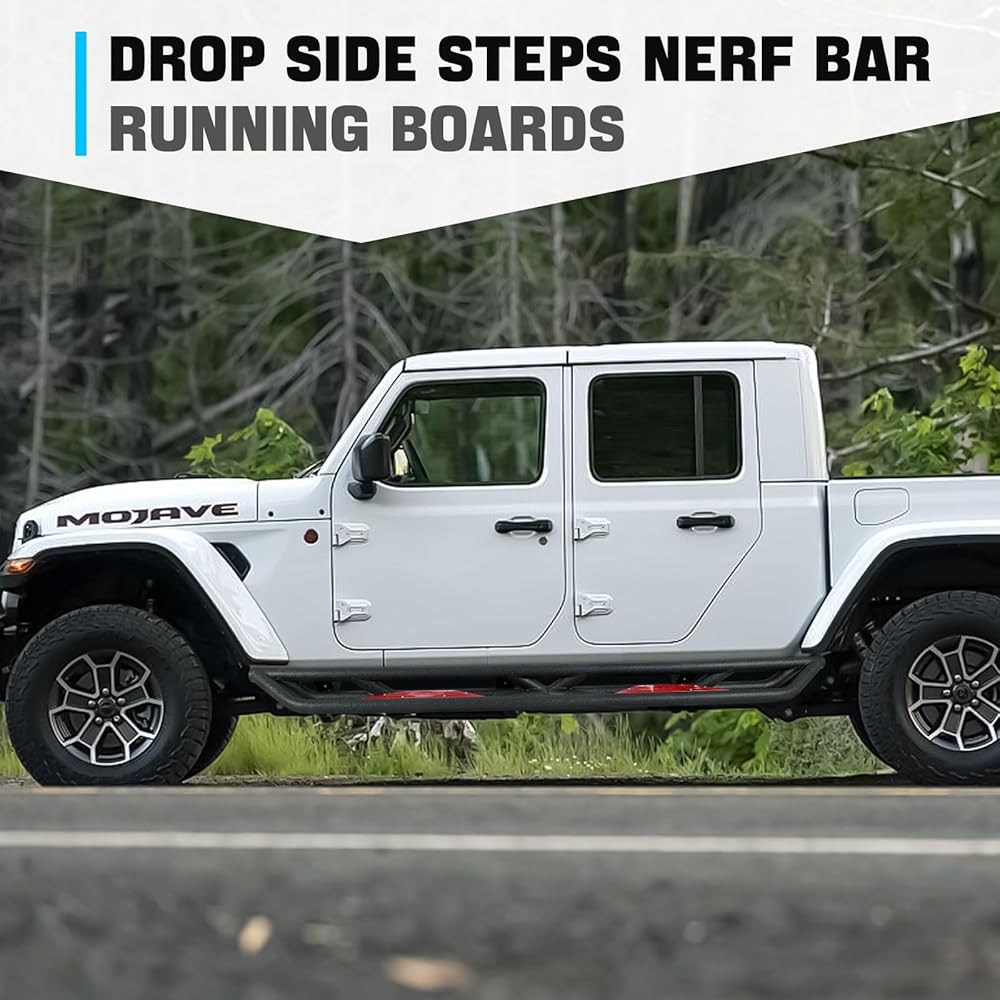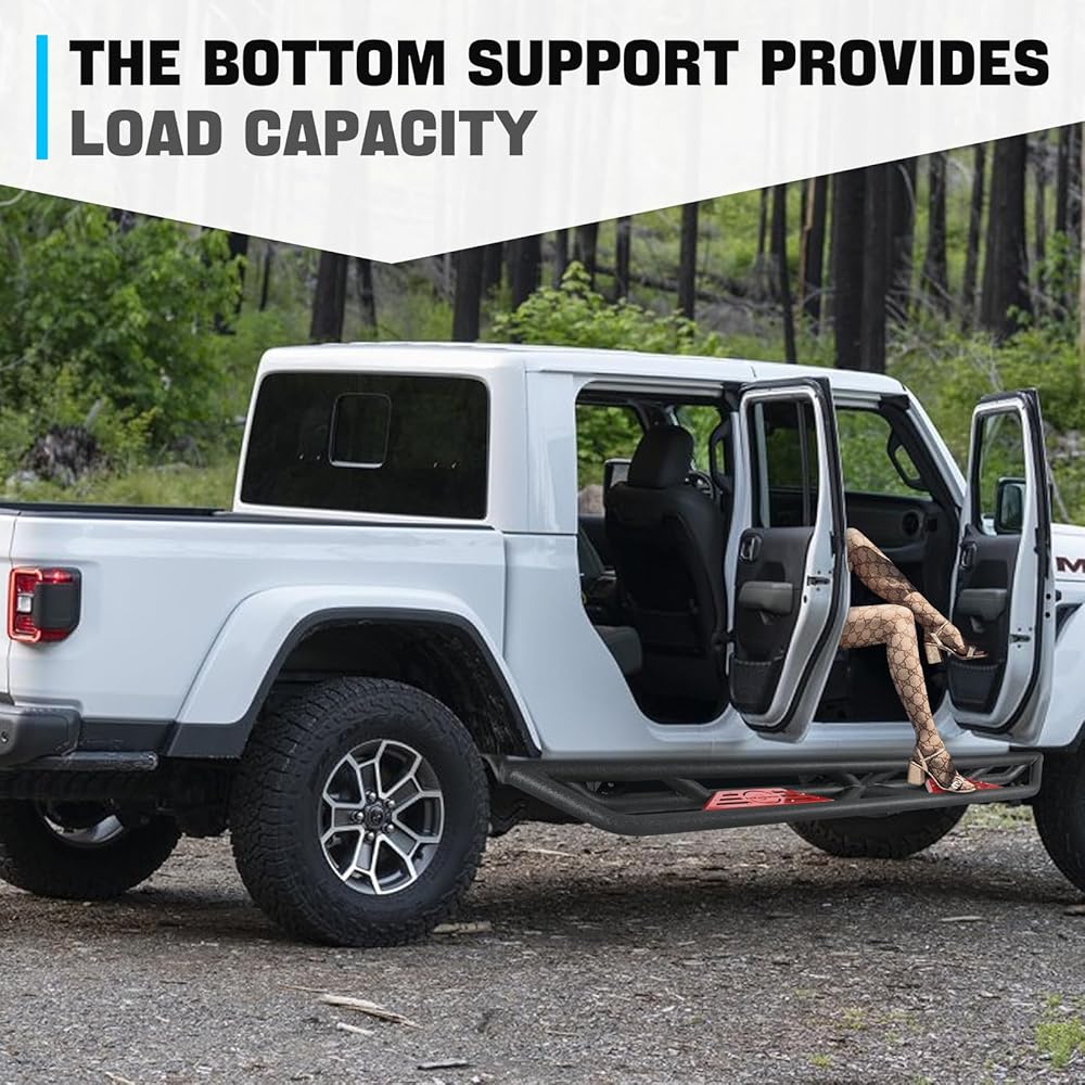 【Functional Convenience】: Gladiator JT running boards are designed with a dual staircase layout and tubular side treads that drop approximately 5.31 inches. Convenient for getting in and out of your vehicle, the side treads provide an extra step and secure foothold when entering and exiting your vehicle, improving traction and stability, thus reducing the risk of slips or falls