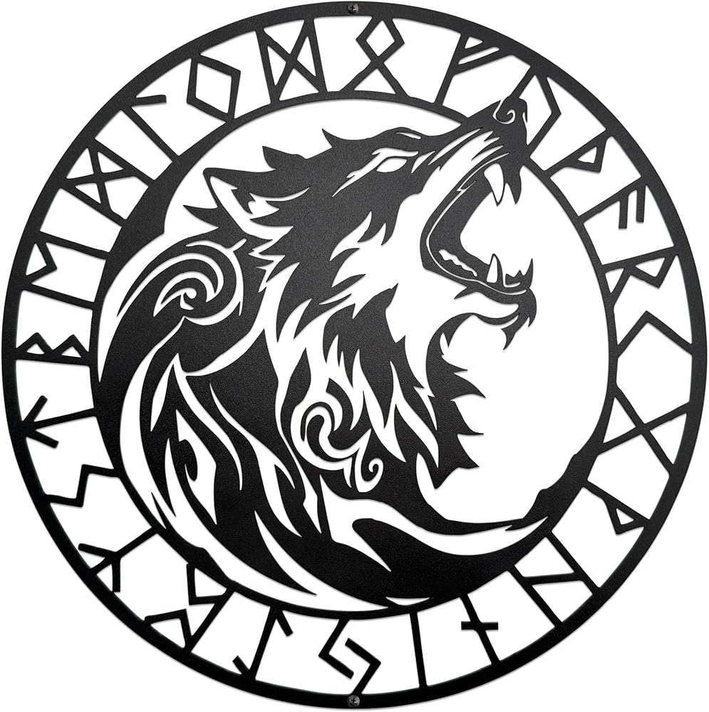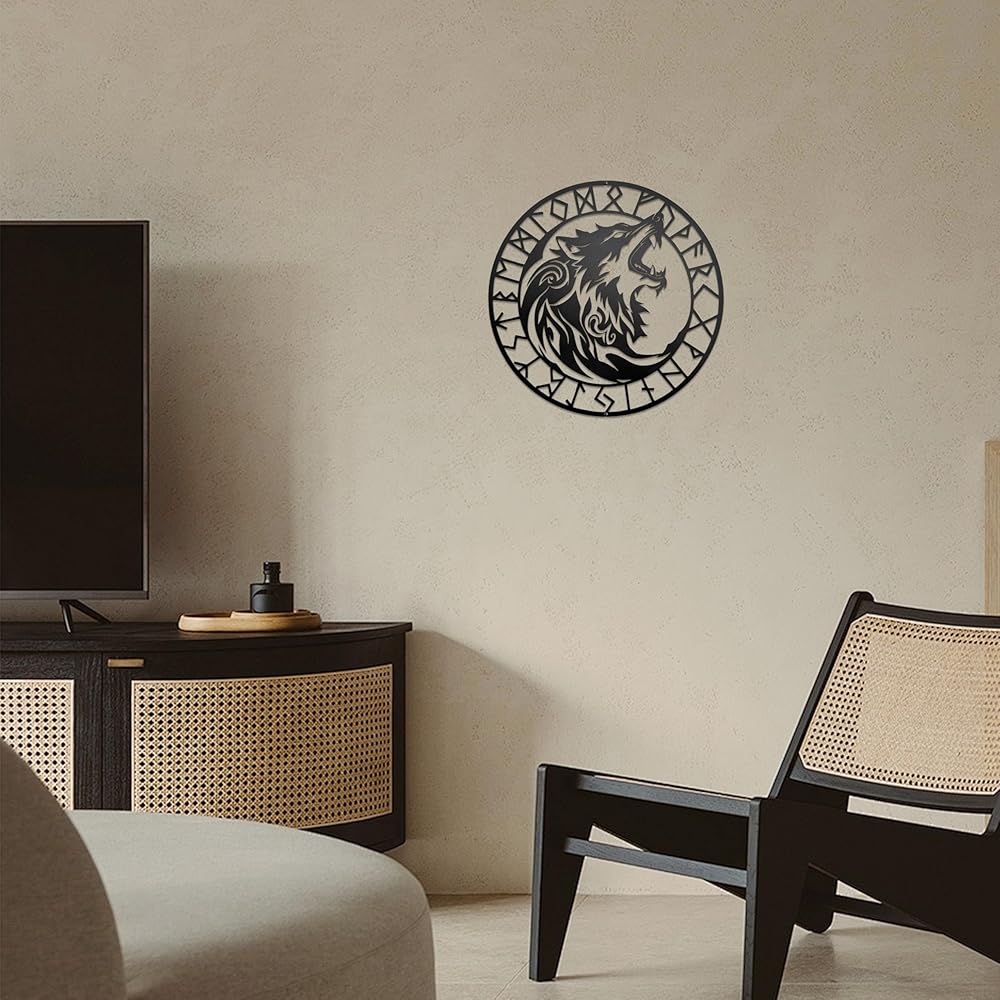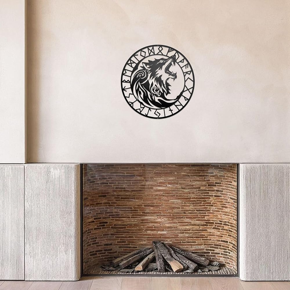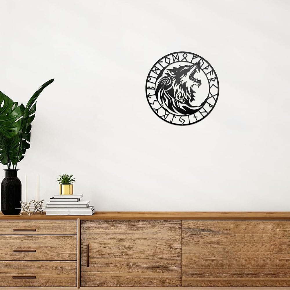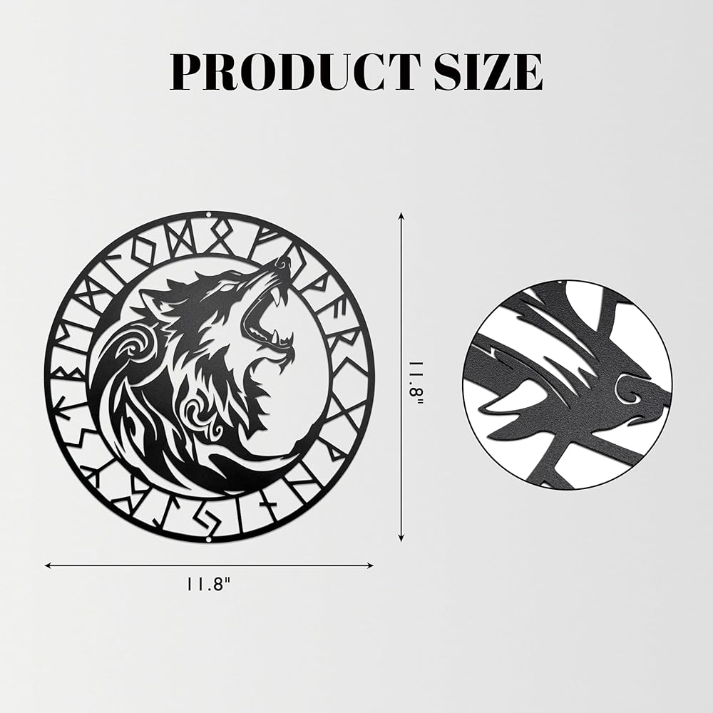 Striking Howling Wolf Design with Viking Runes - This metal wall art features a powerful howling wolf silhouette at its center, encircled by traditional Norse runes in a circular pattern. The design captures the wild spirit and strength of Viking culture, making it a standout piece for viking wall decor in living rooms, offices, or bedrooms. The contrast between the dynamic wolf and geometric runes adds depth and cultural significance to the artwork.