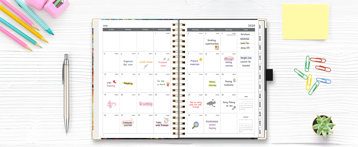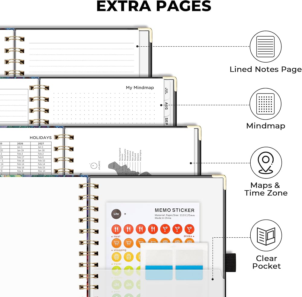 VALUE-PACKED USEFUL PAGES: Includes 2026-2027 Yearly Overviews, Important Dates, Yearly Schedule, Wish List, 20 Lined Pages, Address Book, 2026-2028 Holidays, and US Map & Time Zone—all for diverse organizational needs