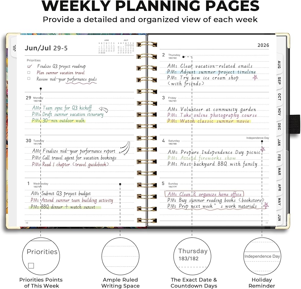 EFFICIENT WEEKLY PLANNING: Each weekly spread includes Current/Remaining Days, Today's Holidays,and Current/Next Month Previews. Ample lined space lets you detail daily plans, track appointments, jot ideas, and manage tasks easily