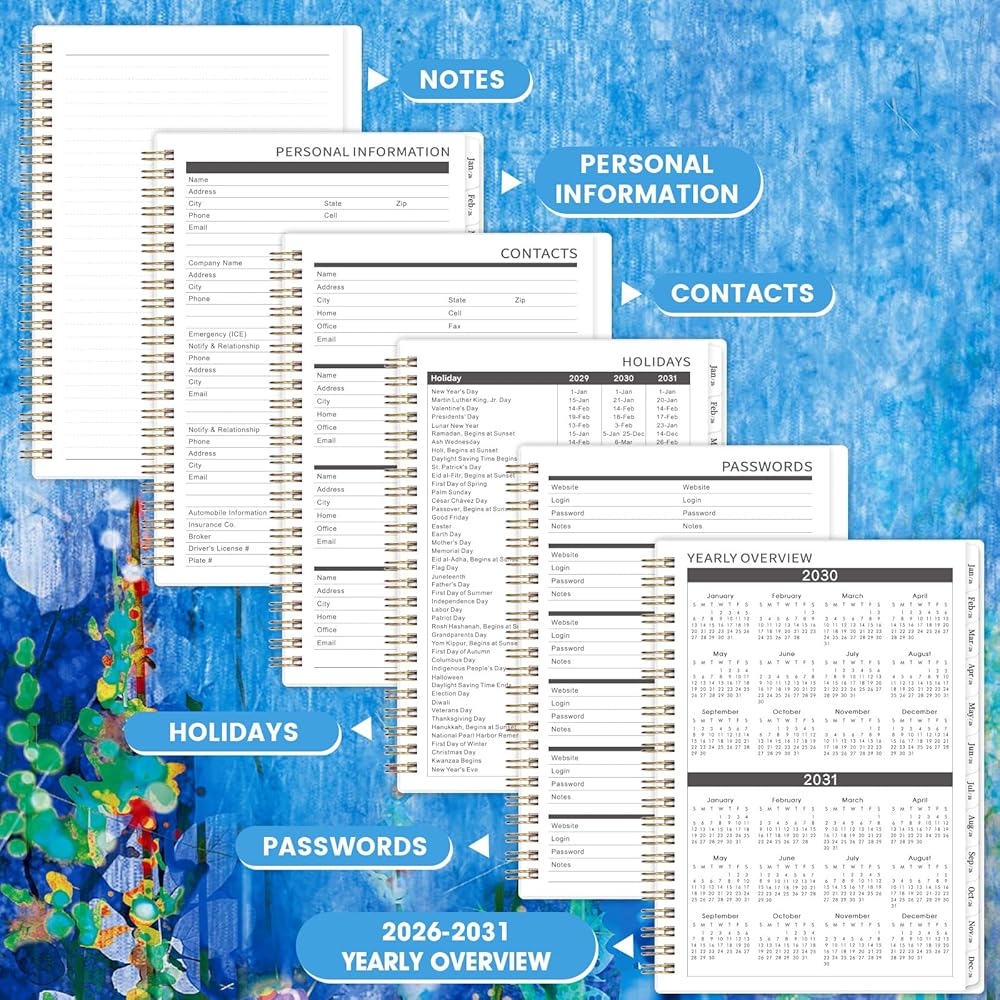💦 2026-2031 MONTHLY PLANNER - 2026-2031 Five-Year Monthly Planner, your companion for long-term planning! Spanning from July 2026 to June 2031, it covers a comprehensive 60 months with detailed monthly pages, each meticulously marked with Julian calendar dates and important holidays. Ensure every step is precise and orderly, paving the way for a brighter future. Own this 2026-2031 monthly planner and embark on a journey of efficient living.
