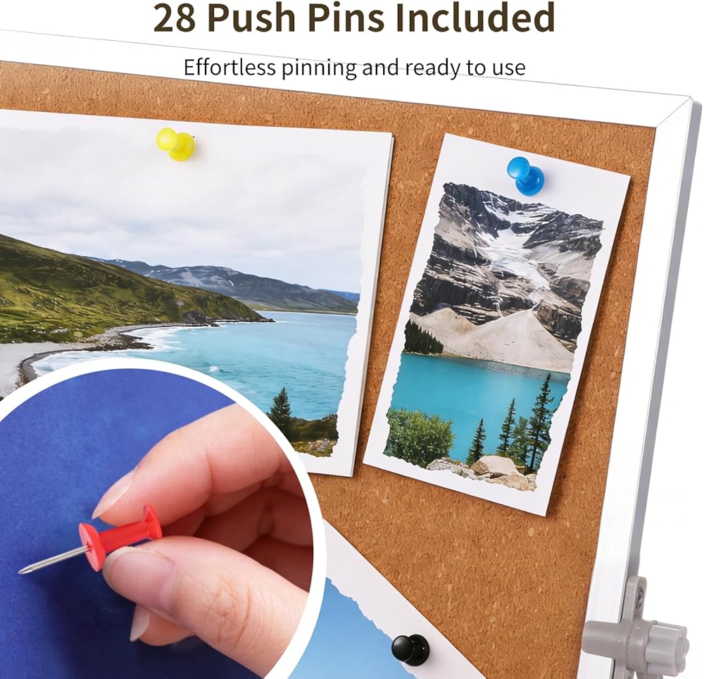 Effortless Pinning and Ready to Use: Crafted from excellent cork material, our desk cork board lets you effortlessly pin notes and photos; the surface reseals pinholes, maintaining a clean look; plus, 28 push pins included, ready to use
