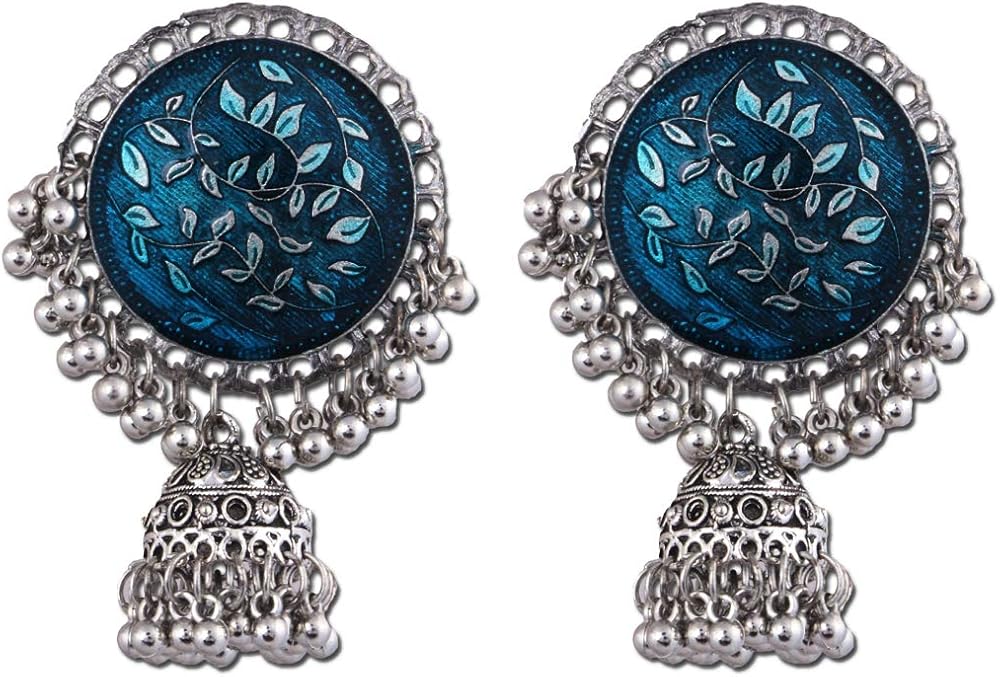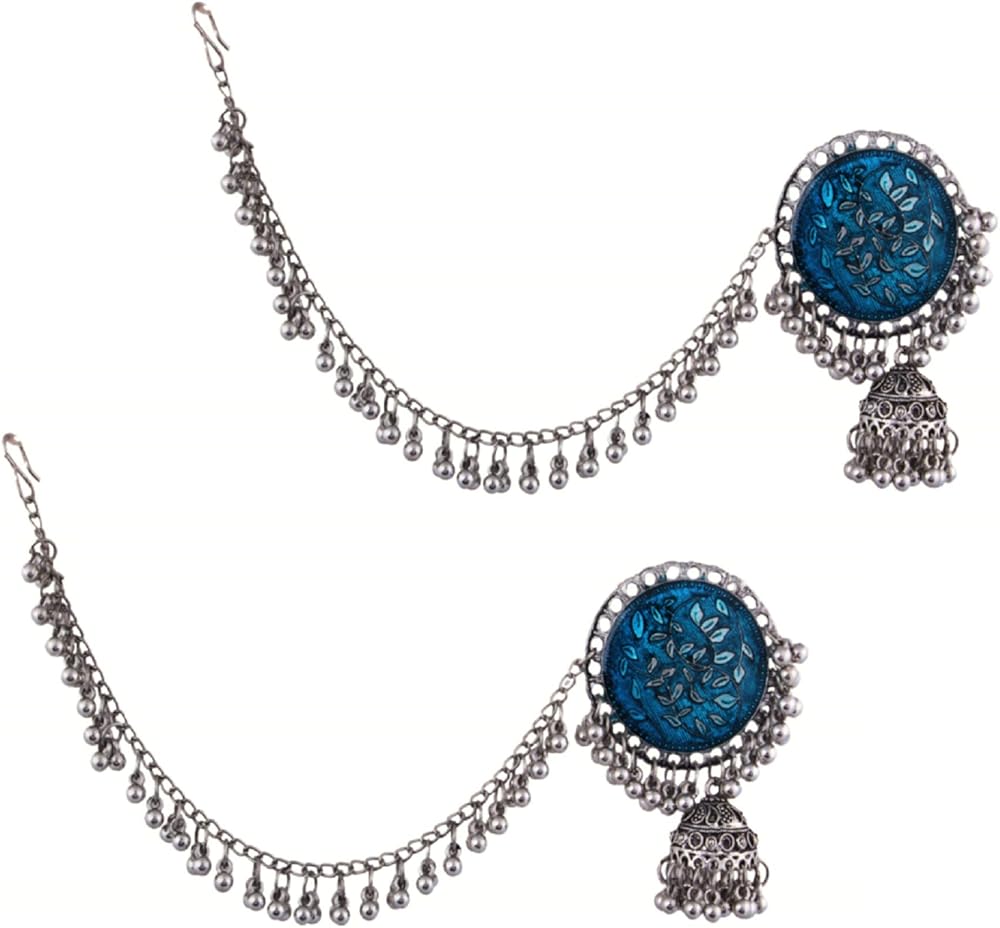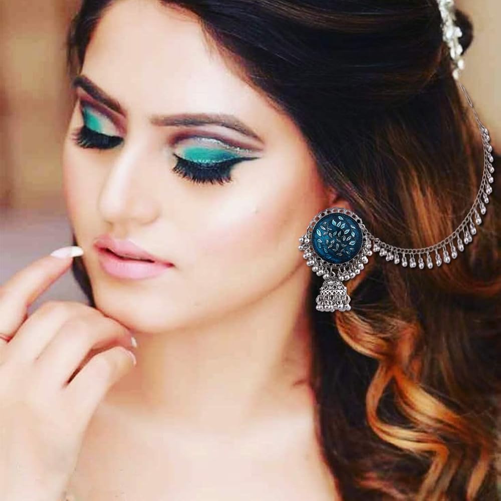 Traditional Bollywood Party- Wear Bahubali Fashion Handmade Oxidized Silver Plated Indian Dangle Chain Jhumki Jhumka Festival Earrings Blue