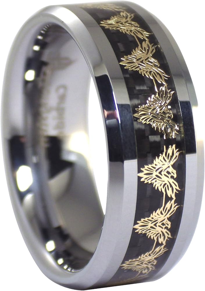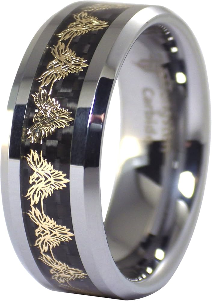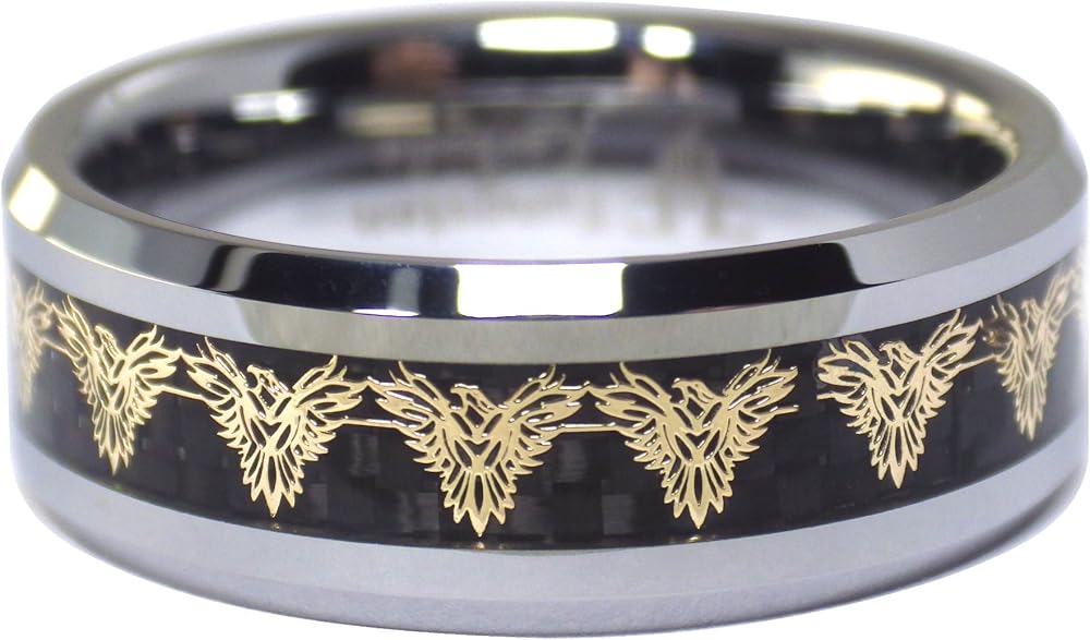 The legend of the phoenix is a unique and beautiful bird that lived six centuries in the desert then burned itself on a funeral pyre and raised from the ashes to live another life. Therefore the phoenix is a symbol of rebirth from the ashes of the past, renewed life and spirit making it a wonderful symbol for an everyday casual, handfasting, anniversary ring, or wedding band. The ring has two inlays a gold color phoenix and black carbon fiber that continues around the entire band, which is then given a clear resin protective finish. The phoenix ring is made of solid tungsten carbide with a high-polish finish. The comfort fit band is 8mm wide. This tungsten phoenix ring is made in sizes 5, 6, 6.5, 7, 7.5, 8, 8.5, 9, 9.5, 10, 10.5, 11, 12, 13, 14, 15, 16, and 17. A gift box is included with the purchase.