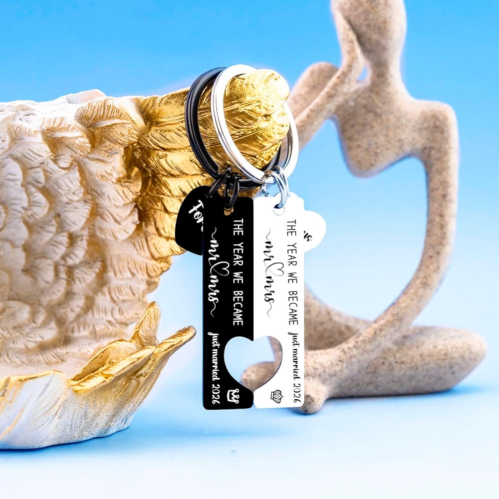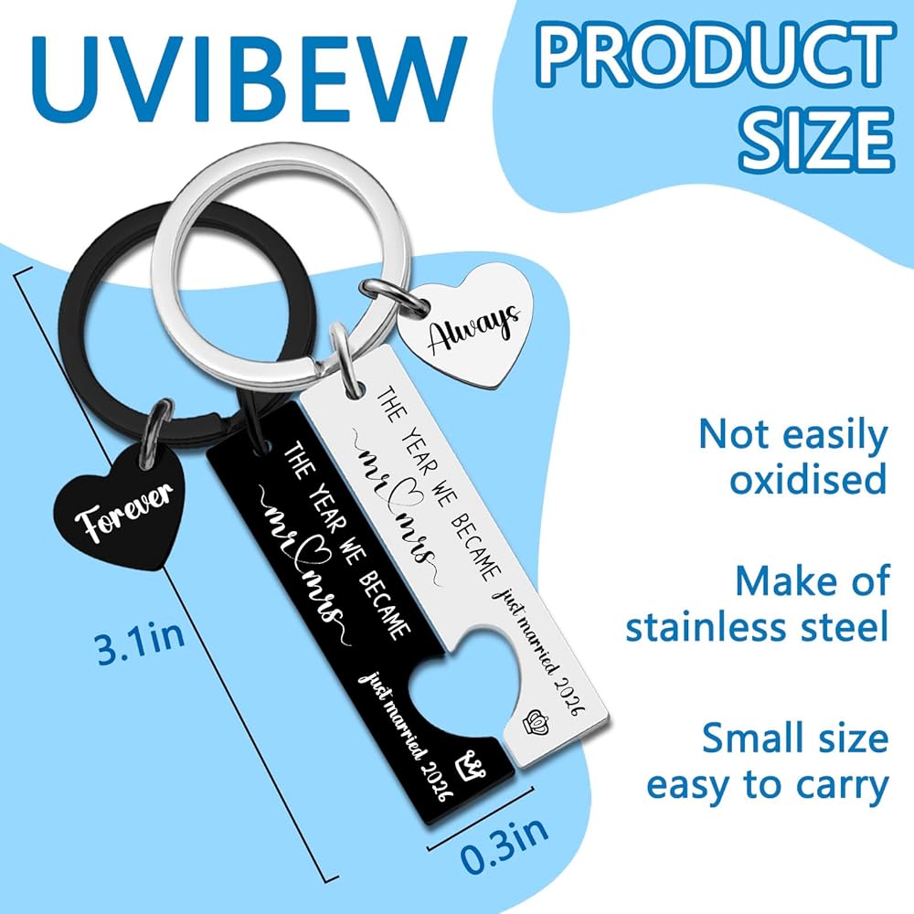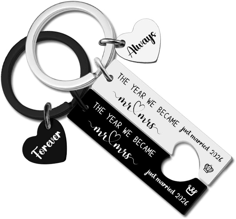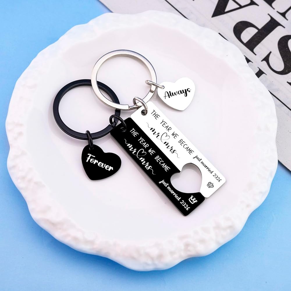 This couple keychain features a double design and is engraved with the words "The Year We Became Mr & Mrs, Just Married 2026," representing a special moment in a couple's life, from courtship to marriage. The accompanying "Always" and "Forever" tags symbolize eternal love and commitment, making it a perfect romantic gift.