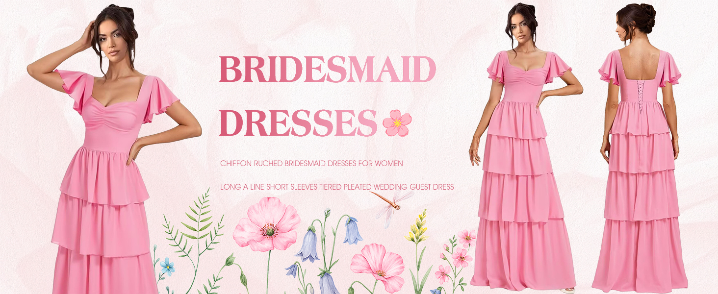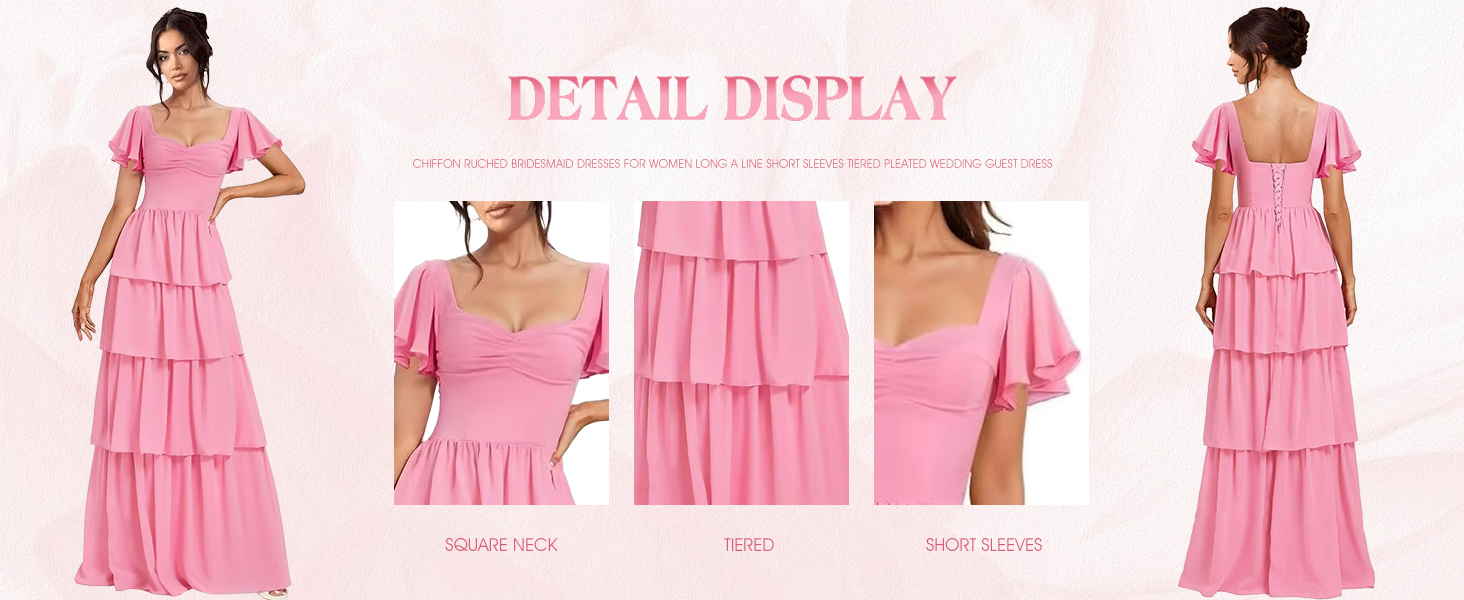 ♥Features:Chiffon A Line Bridesmaid Dresses,Square Neck Tiered Wedding Guest Dress,short sleeves Ruffles Formal Evening Gown.Square Neck,Ruched,Buit in Bra,A Line/Bodycon/Tight,Floor length, short sleeves,Square Neck,Lace up,Fully Lined.