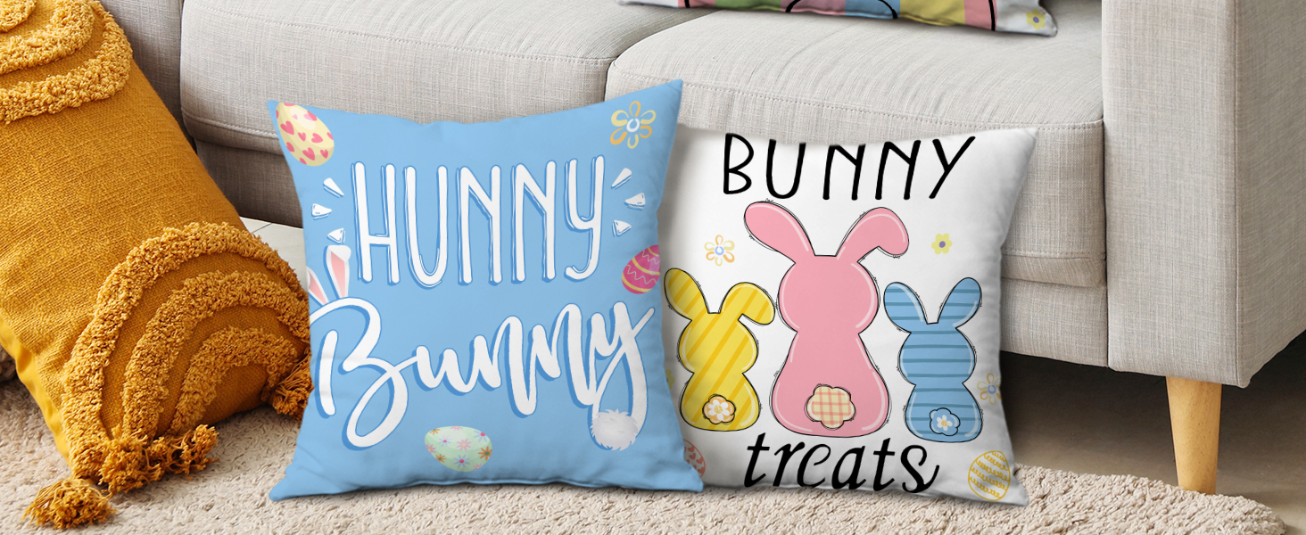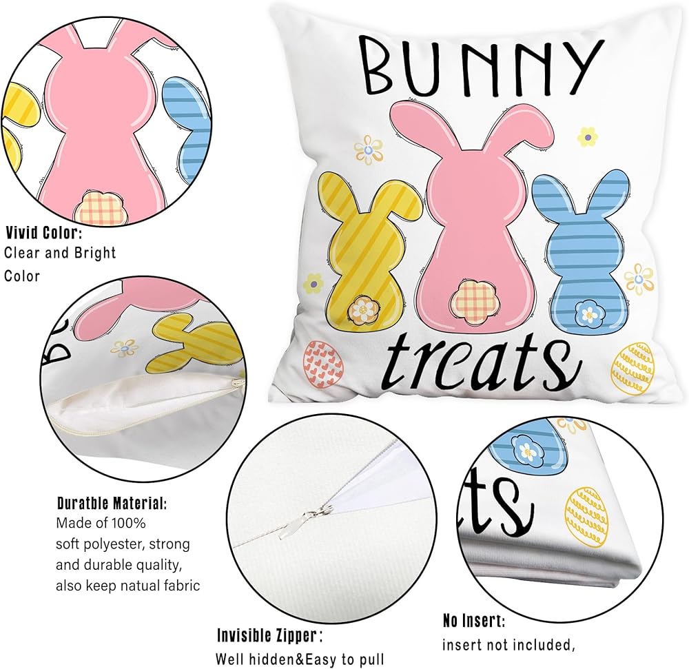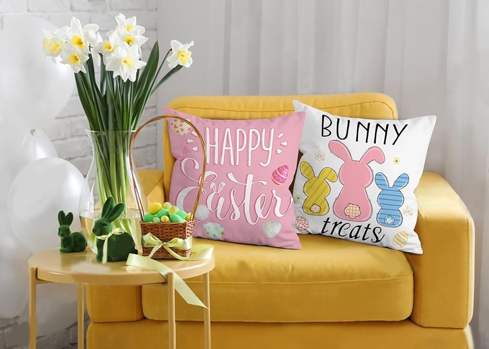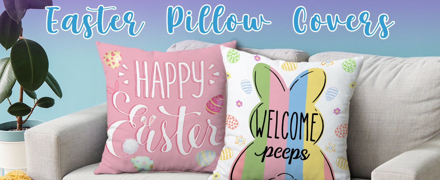 EXQUISITE EASTER GIFTS - Vibrant decorative bunny pillow covers would be a perfect easter decor gifts for women and men. Classic easter bunny, cute peeps and happy easter quotes, yellow pink and blue colors helps u creating perfect festive holidays atmosphere. THEY WOULD BE DELIGHTED WITH YOUR EASTER PILLOW COVERS 18X18 SET OF 4.