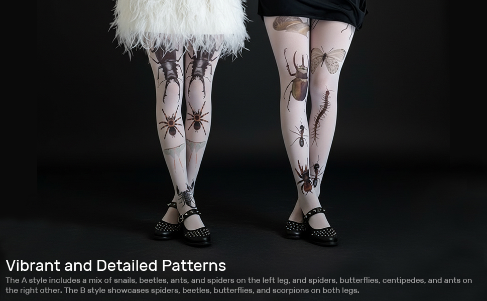 • Vibrant and Detailed Patterns: The A style includes a mix of snails, beetles, ants, and spiders on the left leg, and spiders, butterflies, centipedes, and ants on the right other. The B style showcases spiders, beetles, butterflies, and scorpions on both legs