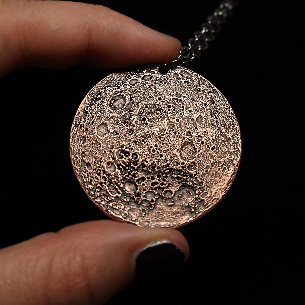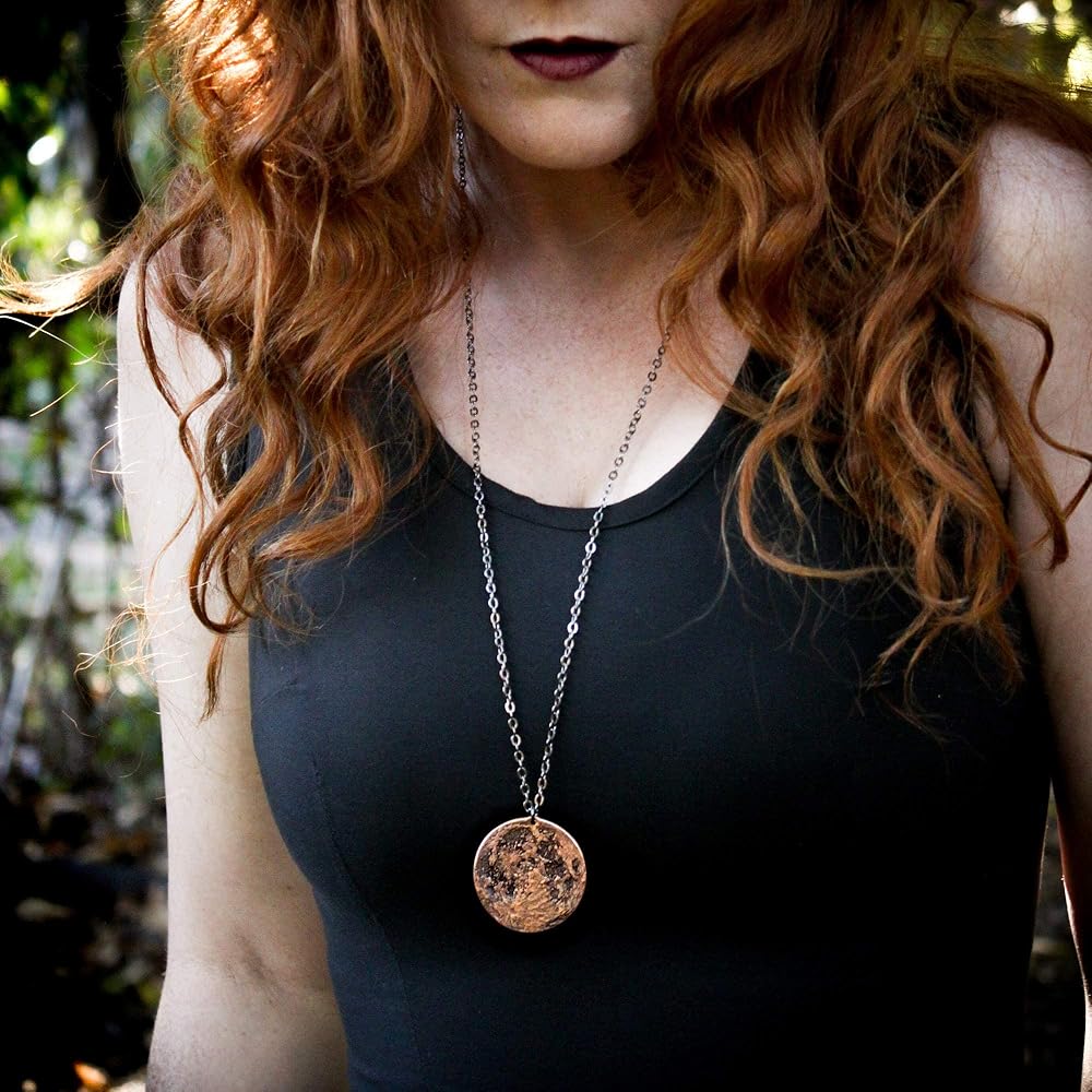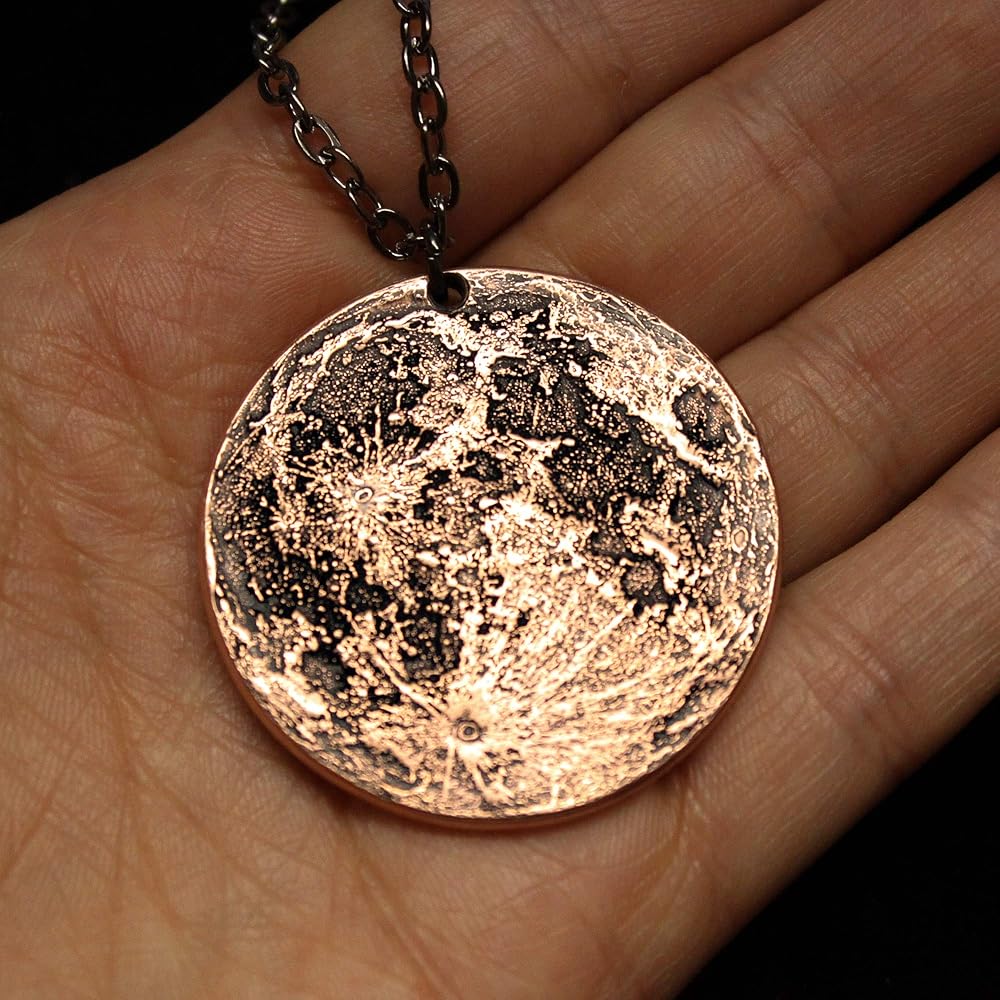 Wear the moon around your neck. This chunky coin necklace features an incredibly detailed engraving of the moon, both the near and far sides! Comes with a 30" stainless steel black-plated chain. The 1.5" pendant is 26 grams of solid copper and is NOT plated. Our customers love the size and heft of this piece. Archival packaging comes with a description of the coin and Moon Facts! Made in the USA using traditional hand engraving techniques, solid metal, and antique equipment. Shire Post Mint is commited to keeping old world coinmaking craft alive Shire Post Mint. All rights reserved.