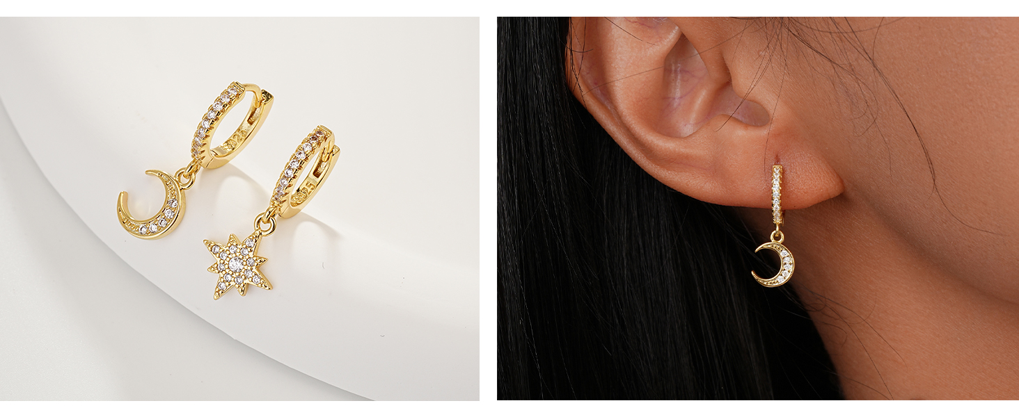 Hypoallergenic Material - These moon and star earrings are made of 925 sterling silver, decorated with 5A cubic zirconia, nickel free, lead-free, safe and comfortable, friendly to people with sensitive skin.