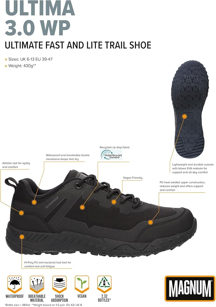 The Ultima Low Waterproof is built with work and comfort in mind. PU welded, abrasion resistant fabric and moisture wicking mesh for protection. High rebound PU insole and lightweight rubber outsole with EVA midsole for comfort. FAST & LITE for agility and athletic proformance.