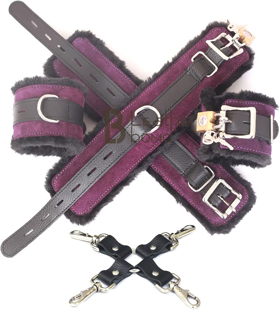 Real Cowhide Leather Wrist Cuffs, Ankle Cuffs Fluffy set with Foam Padding & Fur Lining Handmade