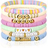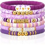 The Heishi surfer bracelets set includes 7 soft clay bracelets with distinct designs, crafted from imitation pearls, metal beads, and soft clay beads for versatile outfit pairing. These bracelets symbolize the wearer's nobility, wisdom, and creativity, reflecting an open and diverse worldview. With smooth-edged, skin-friendly beads, they suit sensitive skin. Ideal for daily wear, parties, music festivals, and more, they also make great gifts.