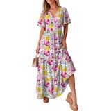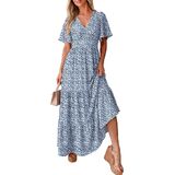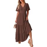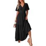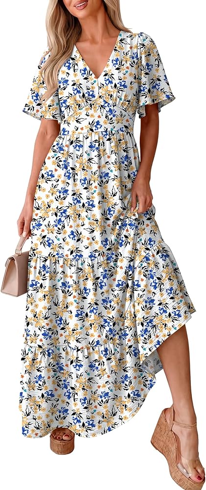 【Features】 - This summer maxi dress features a sexy V-neck at the front, combined with a high-waist cut and elasticated waistband for a comfortable, slim-fitted look. It flatters your figure while ensuring all-day comfort. The ankle-length silhouette is elevated by a flowy hem, paired with casual flutter short sleeves and a tiered ruffle construction with delicate pintucked detailing at the hem. Suitable for casual, work, beach, date, party, honeymoon, holiday, family gathering and photoshoot.