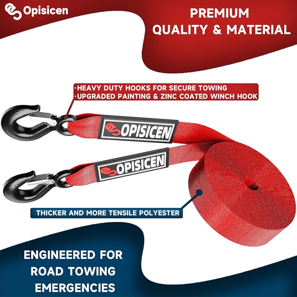 Perfect Security Design:Our upgrade towing straps measures 2" x 20' long woven polyester webbing and outermost layer painting & the zinc coated winch hook has a spring closure for added security. Break Strength of 15,216 lbs