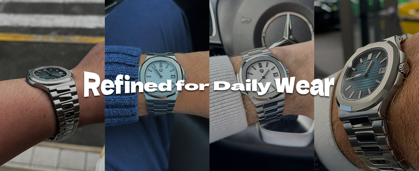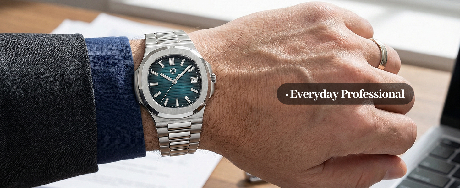 Brushed 316L Stainless Steel Build: Crafted with top-notch brushed 316l stainless steel case and bracelet (with pre-installed half link and screw pins), this watch gives you solid build quality and a refined, versatile look for business or casual use