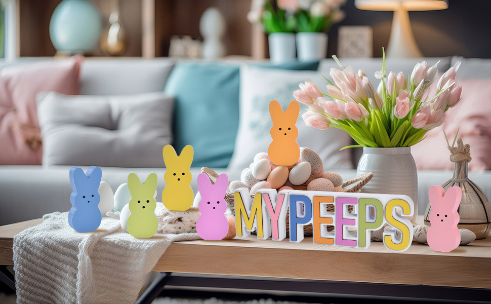 A COMPLETE 8-PIECE EASTER DISPLAY SET: This adorable easter bunny decor collection includes 6 colorful wooden bunnies plus MY and PEEPS 3D letter signs, giving you everything needed to create eye-catching easter decorations for home. Each bunny stands firmly on its own, making it perfect for shelves, tiered trays, mantels, or easter centerpieces for tables.