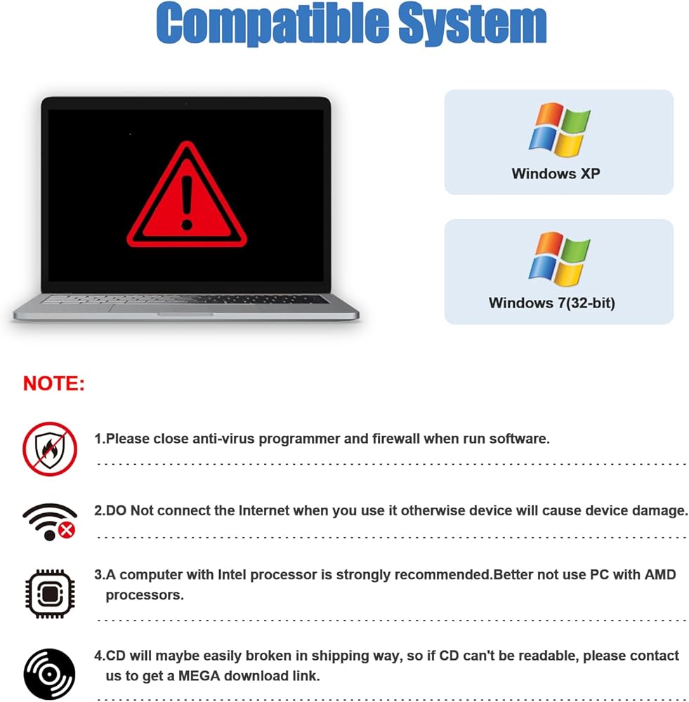 【Important note】1. Please close the anti-virus programme and firewall before running the software. 2. Do not connect to the internet when using the software, otherwise the device may be damaged. 3. This cable only works with the driver/APP provided by us. 4. If your computer has ever had a driver or app installed from elsewhere, the cable will be destroyed by your computer. 5. If this is the case, you must uninstall the driver/APP and reinstall your computer's operating system before using this cable.