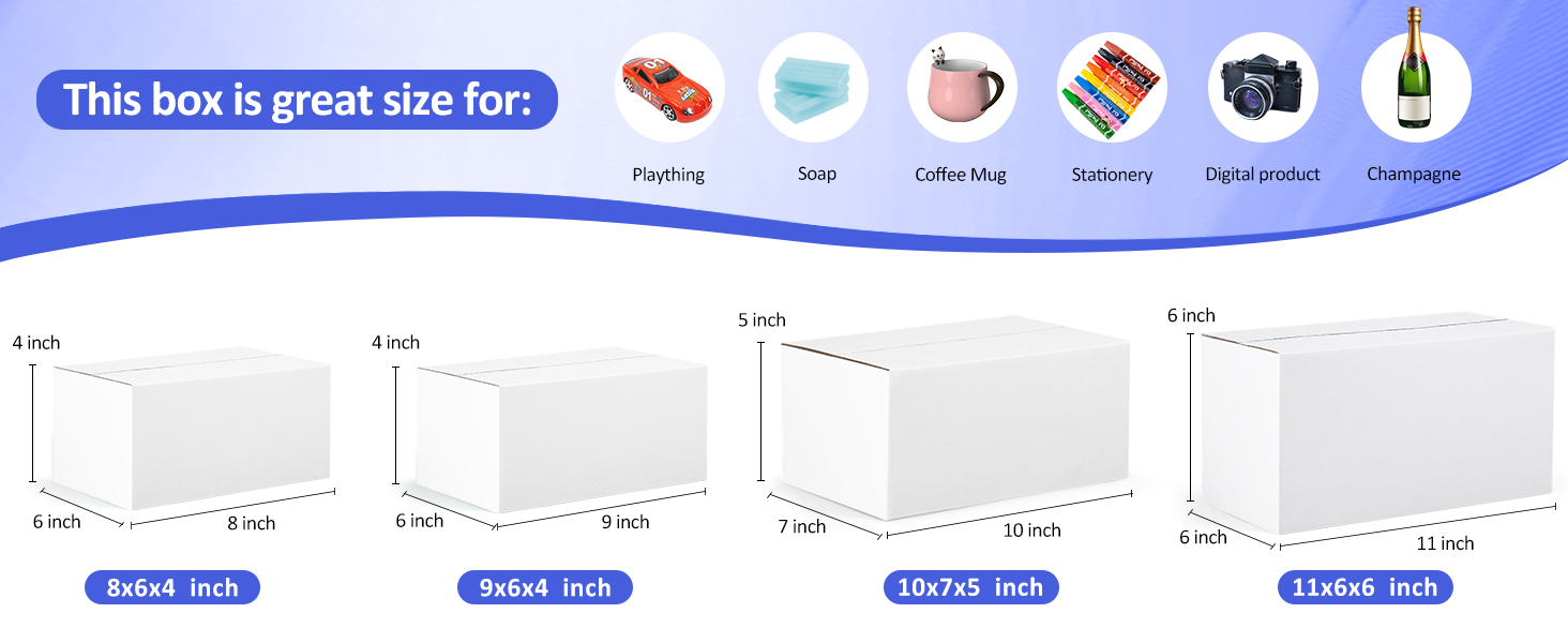 Dimensions and Quantity: Eupako small shipping boxes for small businesses come in four convenient sizes: 8x6x4 inch & 9x6x4 inch, 10x7x5 inch, and 11x6x6 inch. Each size is available in a pack of 3, totaling 12 shipping boxes small. These sturdy small mailing boxes are ideal for safely shipping small items, including soap, glass bottles, candles, pins, books, mugs, cookies, cosmetics, toys, and clothing