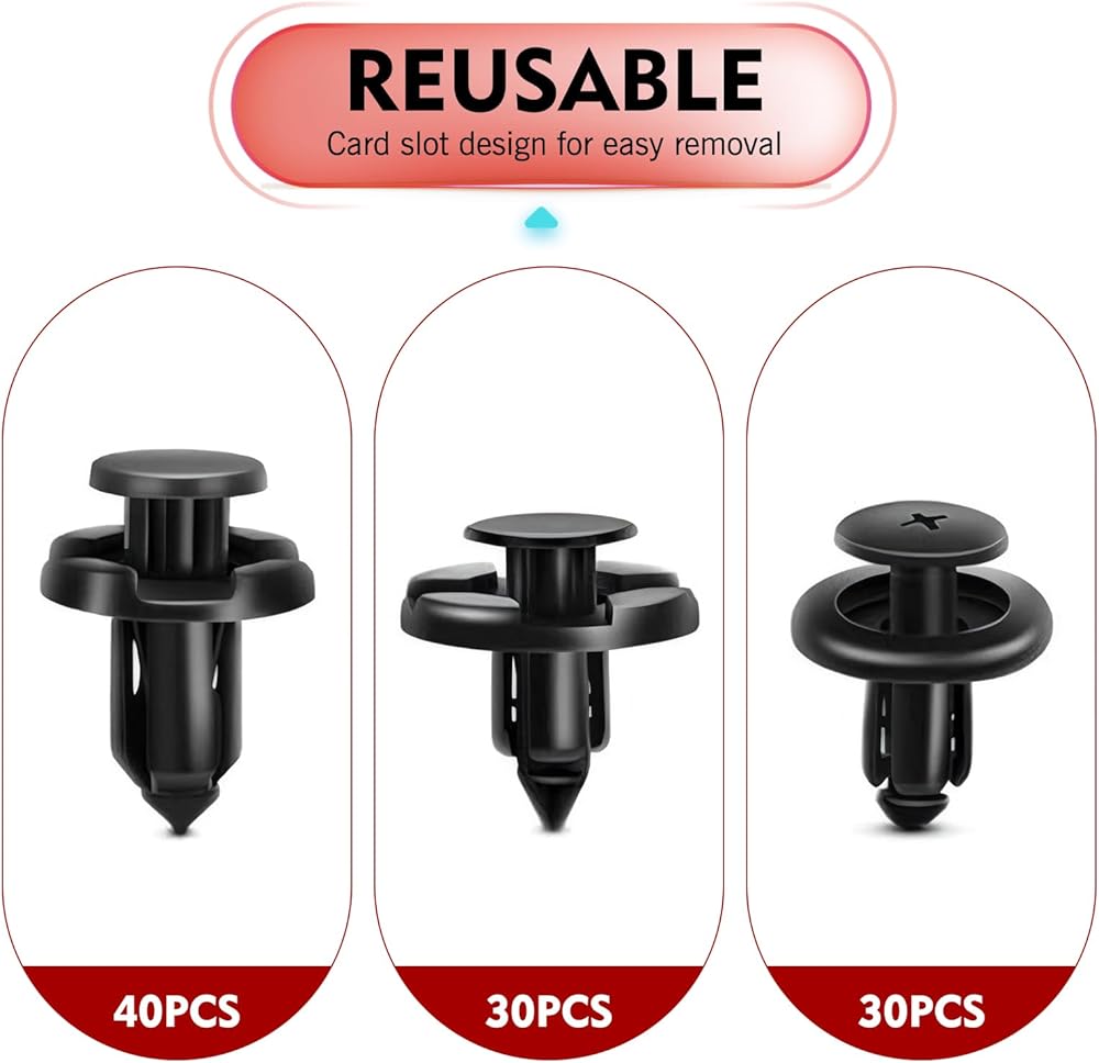 Complete Kit For Multiple Repairs: Get 100 pieces of high quality black nylon car retainer clips in three most-used sizes (7mm, 8mm, 10mm) and one durable fastener removal tool. It covers various needs like fender, bumper, splash shield, door panel, and grille repairs