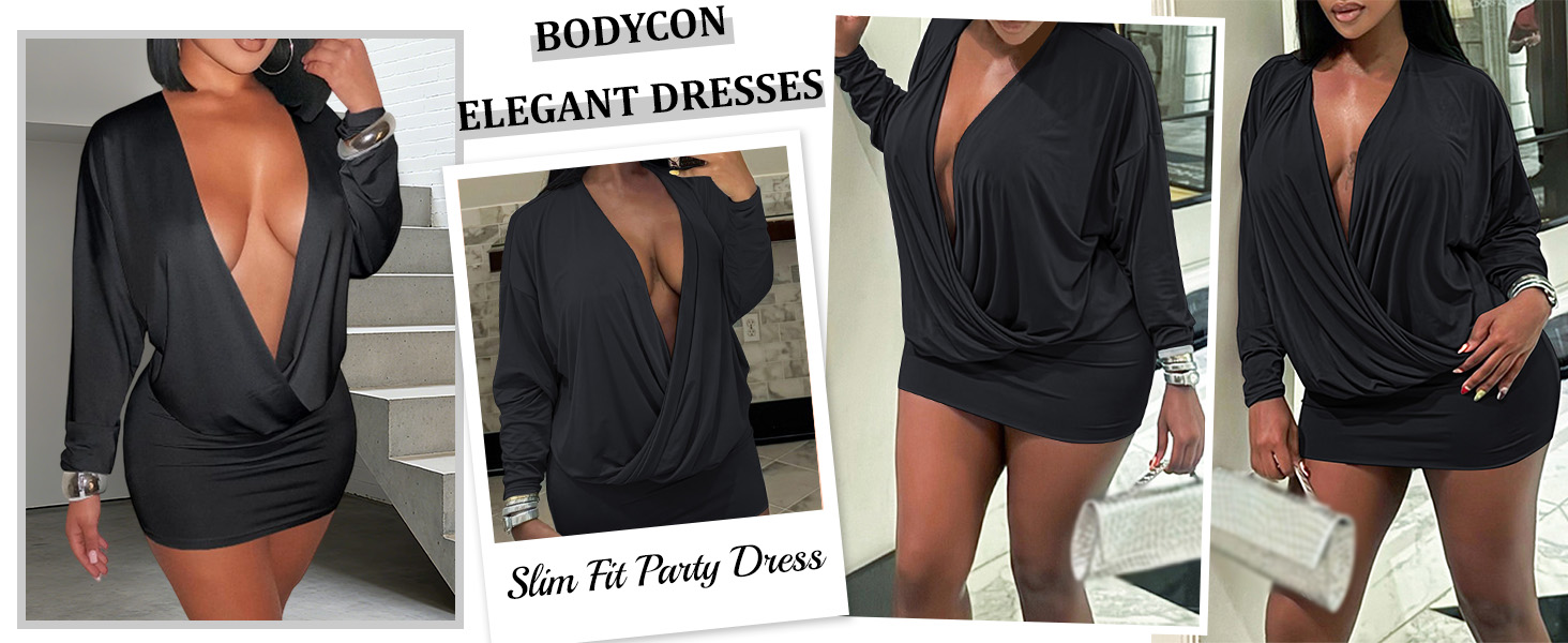 Highlights:The deep V-neck design elongates the neckline, and the three-dimensional pleats drape naturally;The bodycon cut paired with a mini skirt length and comfortable fabric allow for easy movement