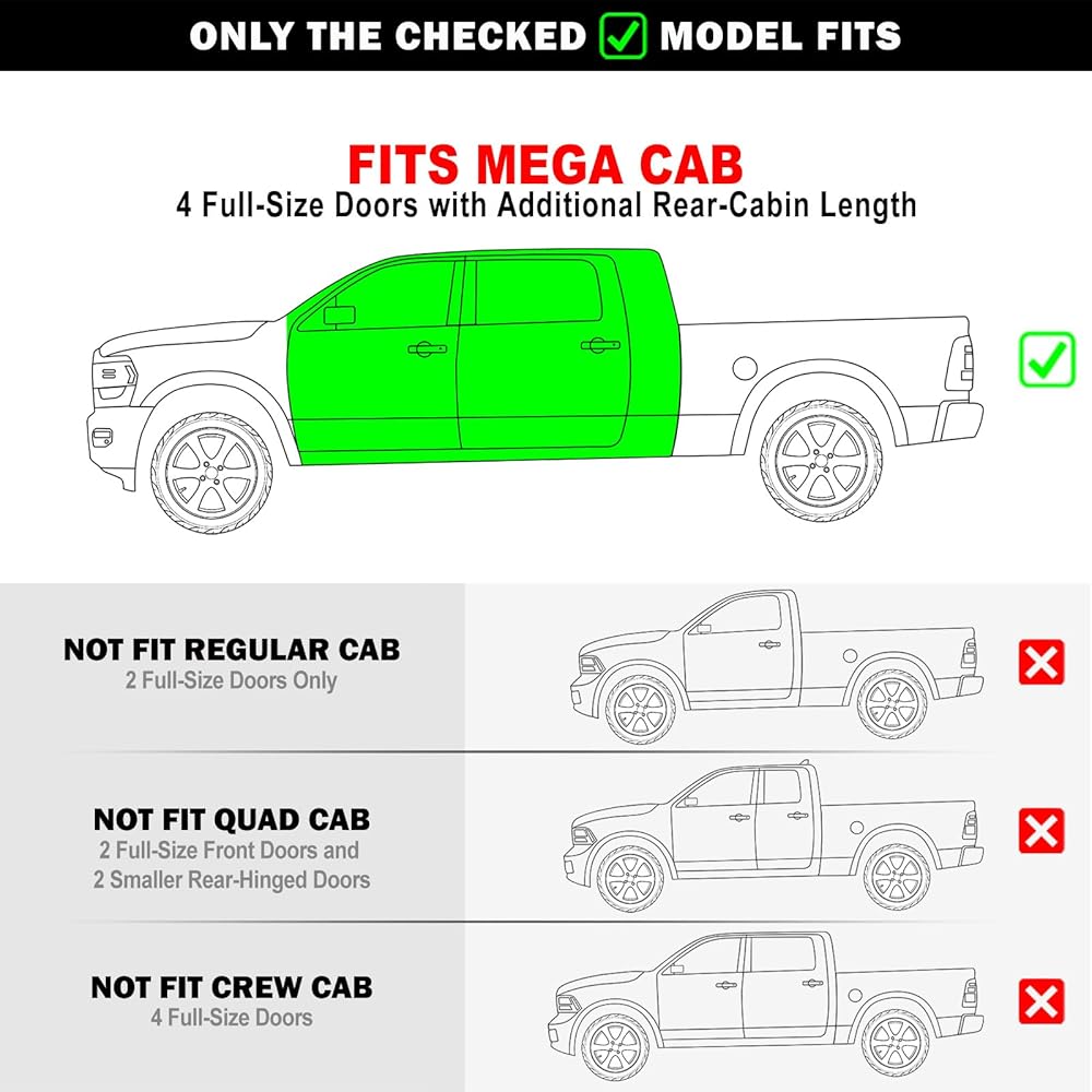 Easy to install Rocker Panel Mount (Drilling May Be Required on Some Models), and Compatible with Ram 2500 3500 2010-2026 Mega Cab (86in D2D Short Version)