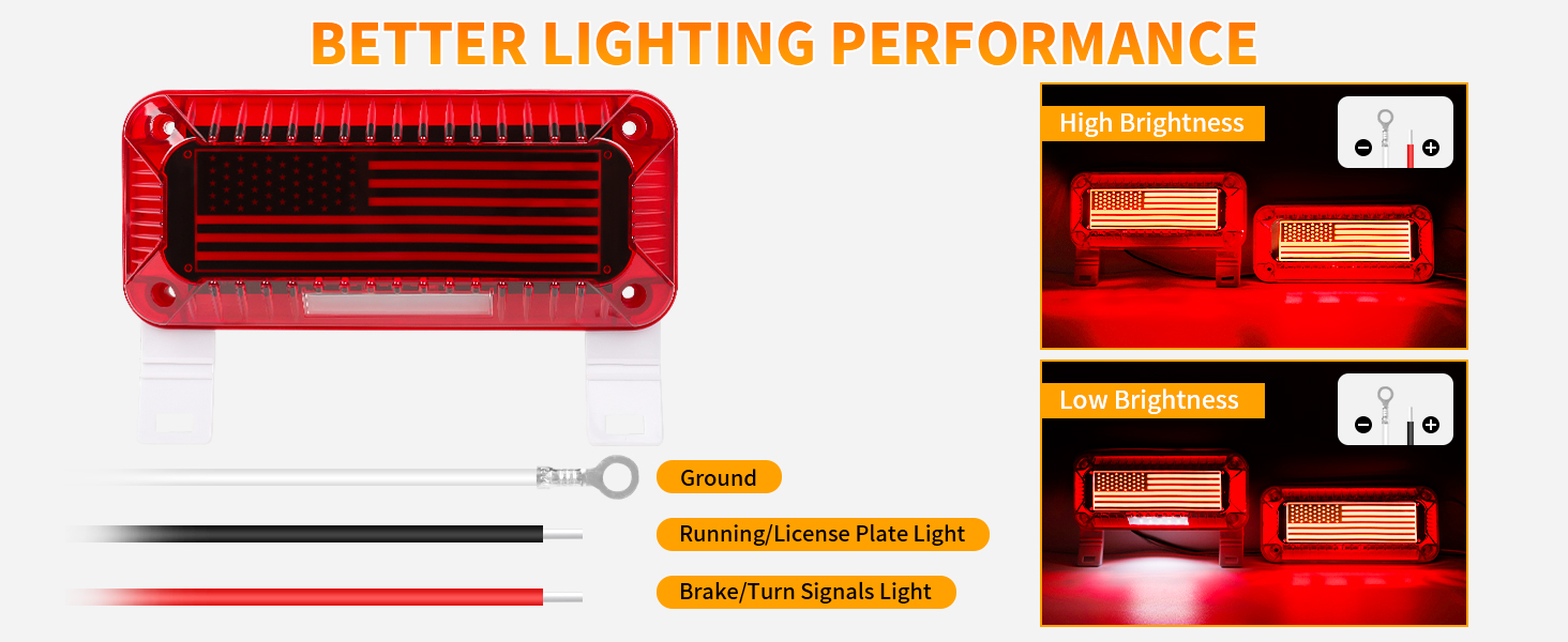 【Patriotic Design & Multi-Function】Showcase American pride with a bold built-in US flag design. This versatile light combines four essential functions into one sleek unit: running light, turn signal, brake light, and license plate illumination for a clean, integrated look.