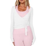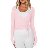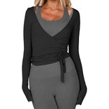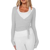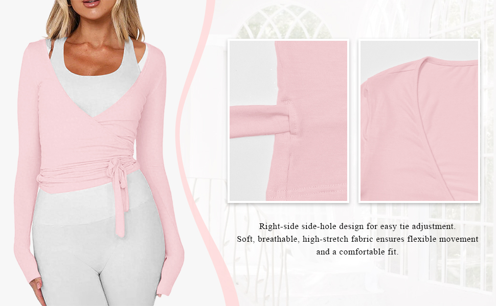 Ballet Wrap Pilates Top: Designed with an elegant front-wrap construction, this pilates top features self-tie straps, a deep V neckline, long sleeves, and a cropped silhouette. A carefully placed side opening allows the wrap to pass through, becoming a functional part of the design. The slim yet flexible fit makes it easy to slip on while supporting comfortable, unrestricted movement.